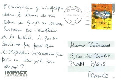 A mon avis, il y a quelqu’un qui a lu mon commentaire jaloux sur le blog de Xarro. Et hop, j’ai reçu une nouvelle carte postale d’un inconnu.