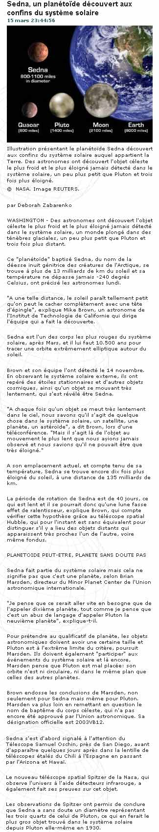 • Ça fait un moment que le statut de « planète » est contesté à Pluton, ce n’est pas précisément depuis qu’on a trouvé Sedna, ou même Quaoar, qu’on le remet en question. Et dans un autre genre, pourquoi Cérès ne serait pas une planète, d’ailleurs ? De toute façon, Sedna ne serait certainement pas la 10e planète, ce serait la 11e après Quaoar, éventuellement 12e, 13e ou 14e après Ixion, Varuna, 2004DW et autres autochtones transneptuniens de la ceinture de Kuiper. La raison pour laquelle Pluton a été considéré comme planète est historique : on cherchait à expliquer des anomalies dans le mouvement d’Uranus (dues, en fait, à une mauvaise connaissance de ses éléments orbitaux) et on (= Percival Lowell, essentiellement) a cherché une planète massive, ce que Pluton n’était pas, mais comme on l’a trouvé à ce moment-là et à cet endroit-là…