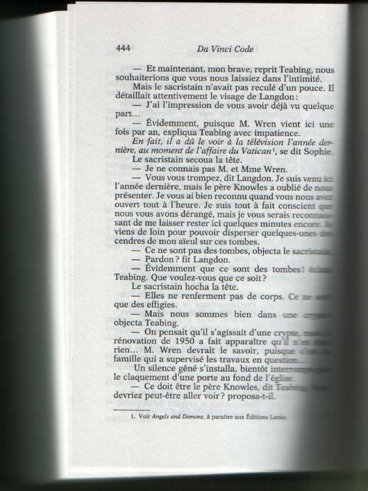 (1) Da Vinci Code, Dan Brown, Traduction de Daniel Roche, Ed. Lattès, mars 2004, ISBN : 2709624931