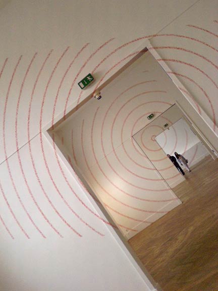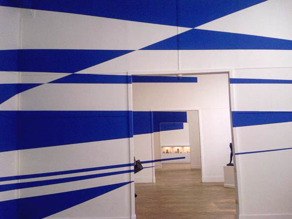 J’aime vraiment beaucoup cette démarche, qui me fait un peu penser à Christo et ses emballages, et qui est plutôt ludique et qui éveille la curiosité. En outre, l’artiste n’essaie pas non plus de nous faire avaler une théorie alambiquée, et cette relative simplicité dans son travail, des lignes tracées la nuit grâce à des projecteurs sur des bâtiments (et puis on colle des rubans sur les lignes), en contraste avec ses effets spectaculaires sur le public font que j’ai beaucoup apprécié son oeuvre ainsi présentée.