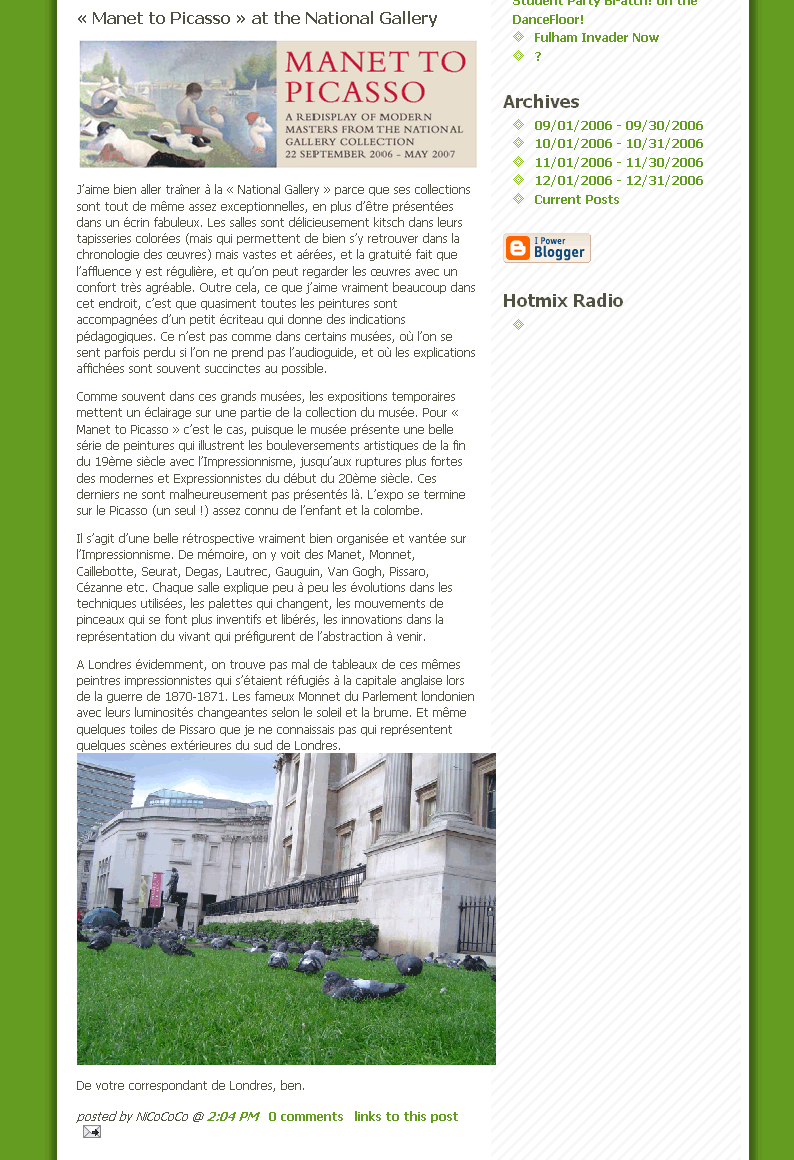 La première fois ça fait bizarre, et puis la seconde on se dit « Bon bah non, ça existe bien. ». Il faut se rendre à l’évidence : par flemme ou pure malhonnêteté, certaines personnes plagient bel et bien des posts pour alimenter leurs propres blogs. La fois précédente, c’est parce que par hasard un lecteur me l’a signalé, là c’est une bêtise de débutant du plagiaire. En effet, il a donc copier-coller un article que j’avais écrit (et pas très bien je trouve !) sur ma visite à une expo à la « National Gallery » lors de mon dernier week-end à Londres. Mais au lieu de copier aussi l’image qui était en illustration, il l’a simplement liée (et utilise donc de surcroît ma bande-passante), du coup un referer est apparu et m’a indiqué ce lien, et j’ai constaté le pillage.