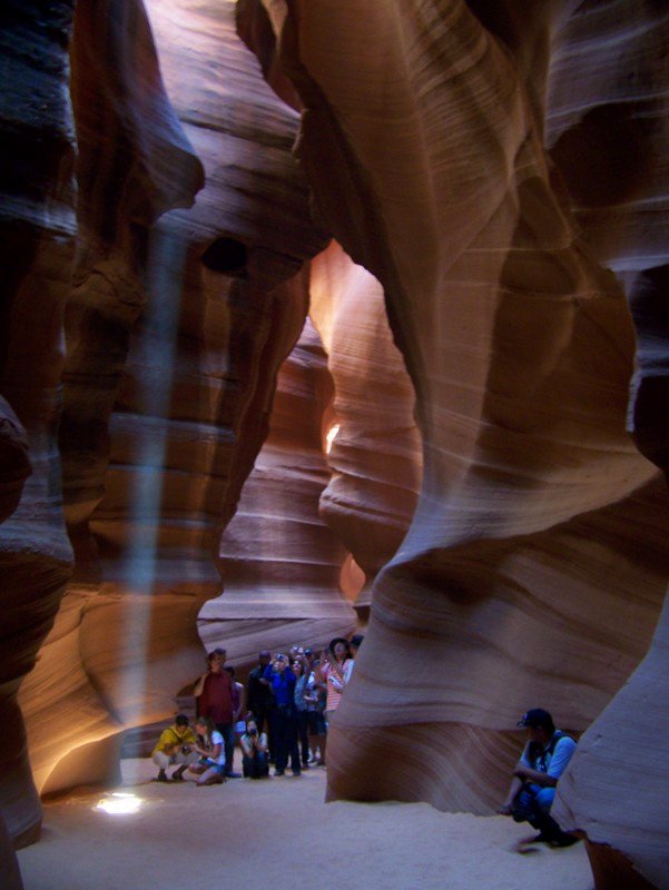 Nous avons commencé à visiter le Upper Antelope Canyon. Voilà pour vous donner une idée de la taille des parois et du dessins de ses formes érodées. Vous pouvez voir la taille des gens qui visitent, et les rais de lumières, ainsi que l’effet très photogéniques sur les murs.