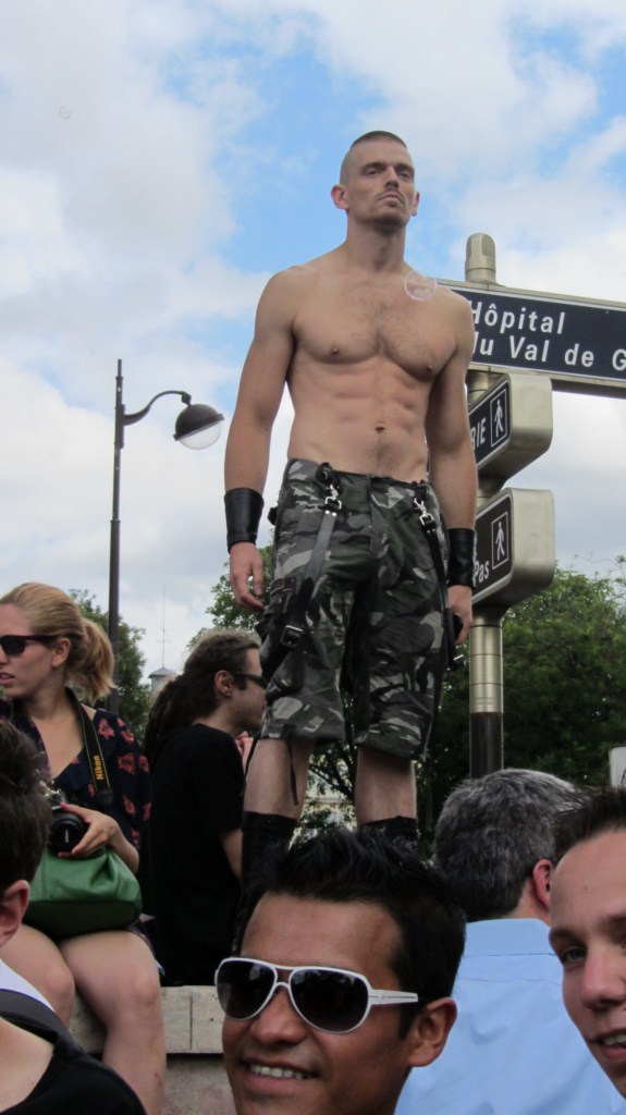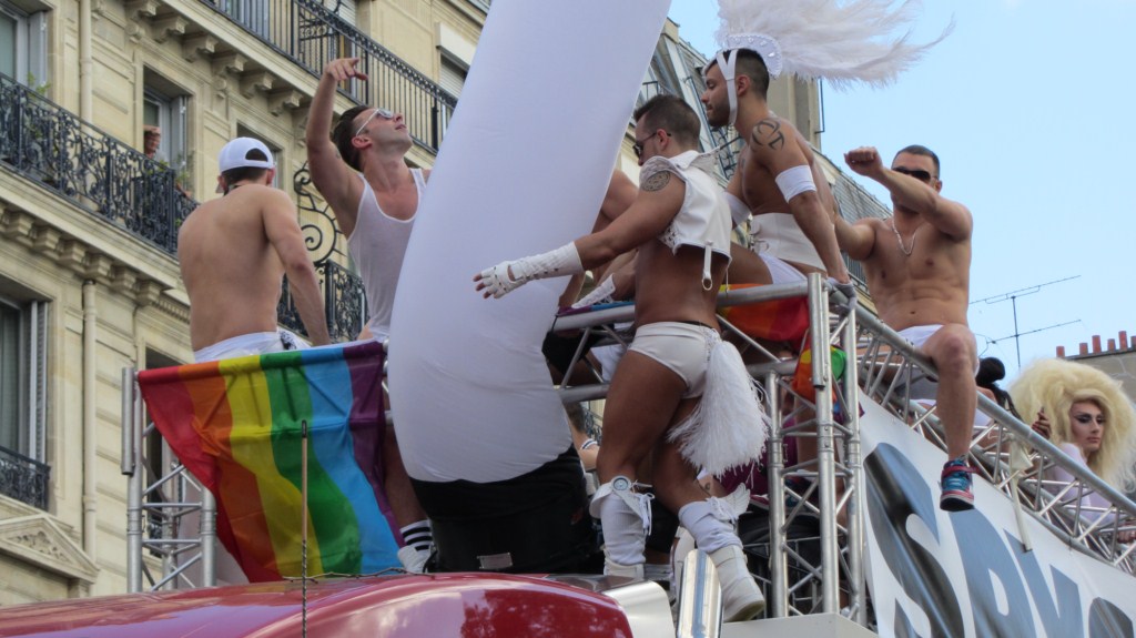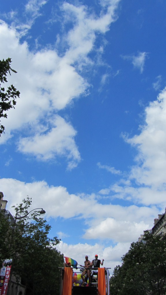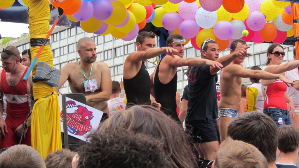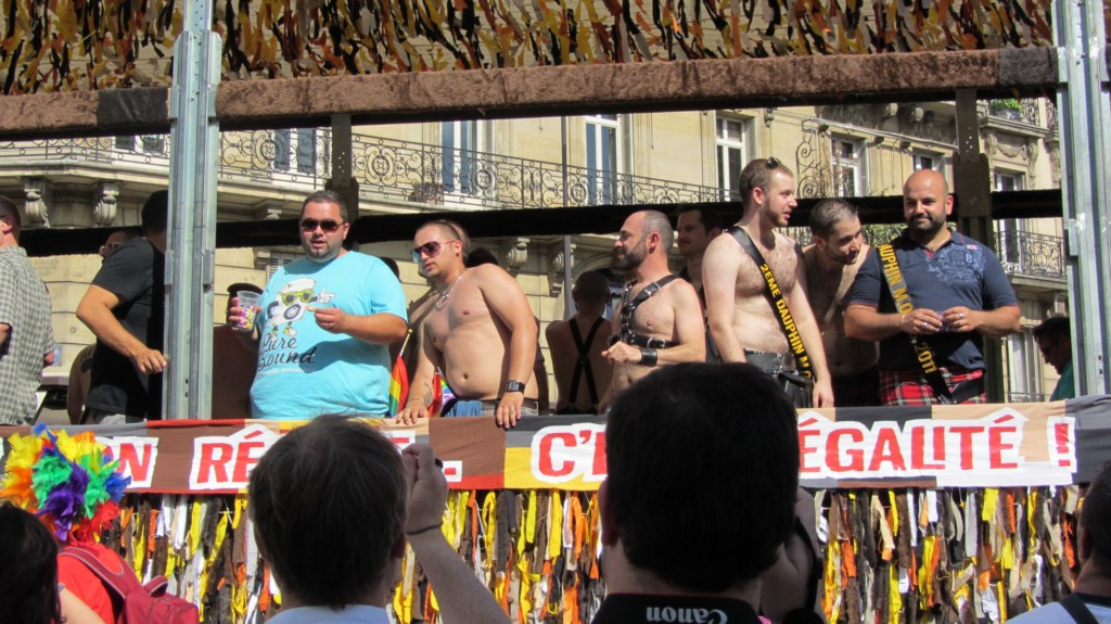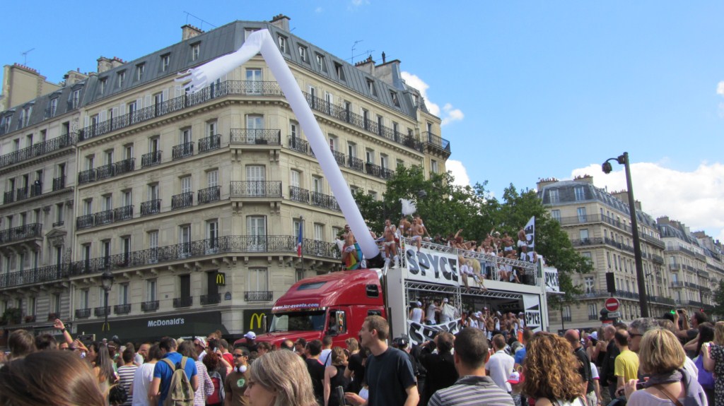 J’ai été un peu déçu qu’il y ait si peu de chars festifs et derrière lesquels faire la fête. A part cette année Têtu, la FSGL (Fédération Sportive LGBT) ou le Spyce, sinon c’était très calme… Et le seul char qui m’a rappelé mes vertes années de Gay Pride endiablée avec toutes les boites et bars de nuit qui défilaient (Queen, Scorp, Pulp, Scream, Open Café, Cox, etc.) était celui du Spyce qui avait mis les moyens et les « hommes ».