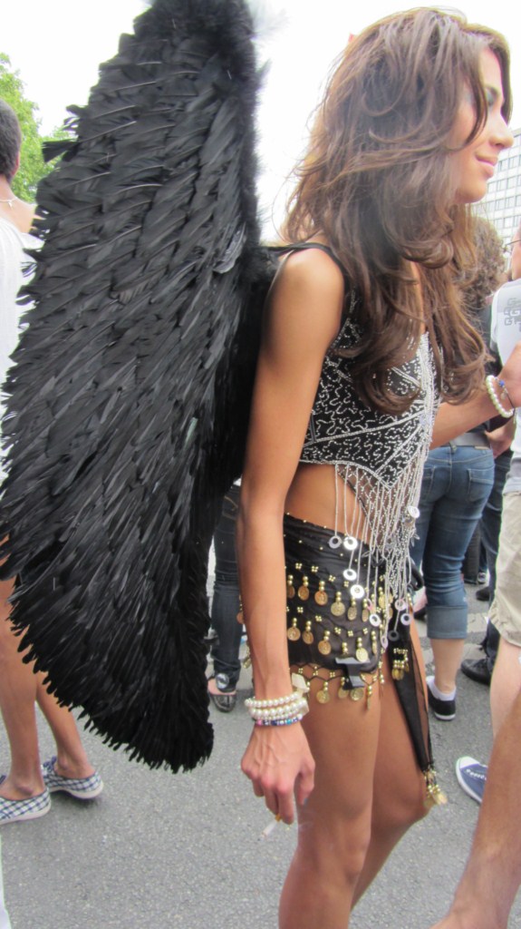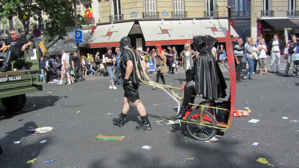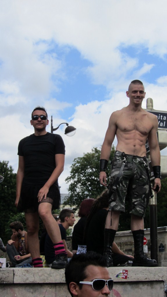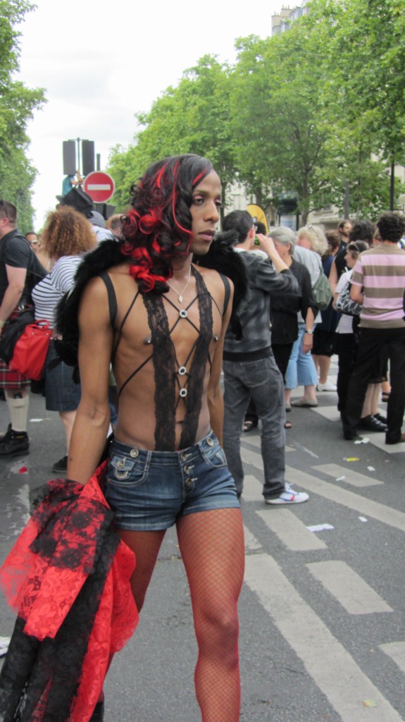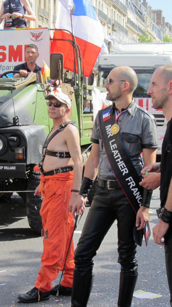 Et cette année était, à mon avis, beaucoup plus classique dans les looks que les années précédentes, beaucoup moins queer et tordu(e)s encore qu’avant. Heureusement il reste quelques fétichistes tout adorables et chouchou tout plein sous leurs abords patibulaires avec leurs chaînes, leurs attirails SM et esclaves en laisse. On voit aussi pas mal de trans à moitié à oilpé qui se montrent, et tant mieux !! Rien à branler que cela soit montré au journal de 20h, parce qu’aujourd’hui TOUT est montré, le pédé lambda présentable et assimilable à M. et Mme Michu comme la folle tordue (qu’on a aussi largement vu dans les téléréalités), la cuirette (banquier d’affaire la journée hein…) ou encore la Gym Queen (qui en viendrait presque à perdre son statut de cliché, alléluia !). La réalité de la communauté une fois qu’elle est largement exposée, c’est qu’il y a autant de sortes de pédés que d’individus eux-mêmes, et je crois que c’est une idée qui fait doucement son chemin. Et surtout, il ne faut pas accepter d’un côté pour stigmatiser de l’autre, et c’est en cela que je continue à me reconnaître dans la Gay Pride.