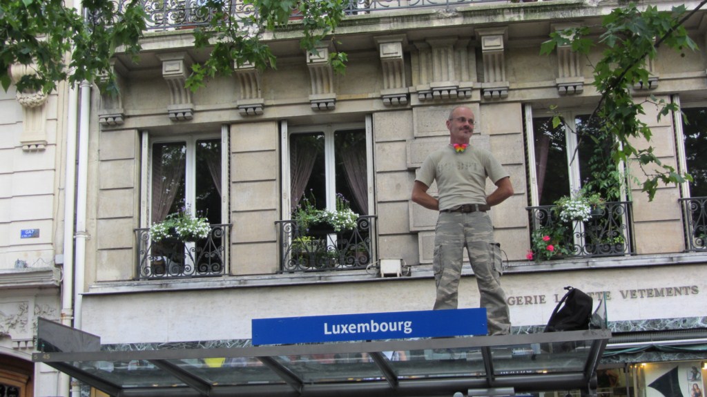 Nous nous sommes, comme tous les ans, donnés rendez-vous devant le « Bal Bullier » vers Port-Royal. Comme c’est devenu un véritable rituel, maintenant j’y retrouve énormément de potes qui savent qu’en début de Gay Pride j’y prends mes quartiers, on a donc mis pas mal de temps à décoller. Huhu. A quelques pas de là, j’ai surtout retrouvé avec bonheur mon cher « ami » de mes visions paramnésiques passées, présentes et certainement à venir. Pour la cinquième année donc, je l’ai pris en photo, et mon chéri est même allé trôner à ses côtés pour l’occasion (regardez ça le fait même sourire on dirait !!!).