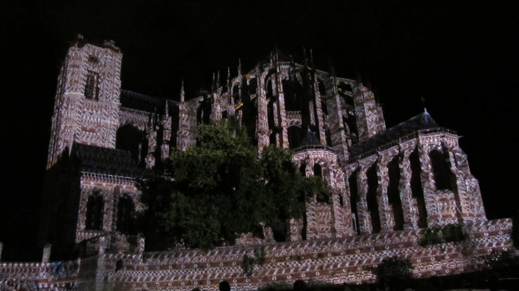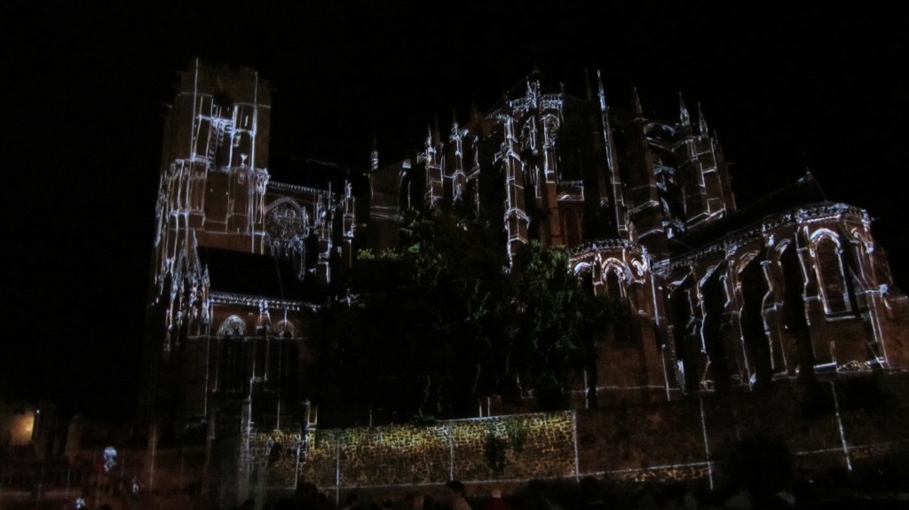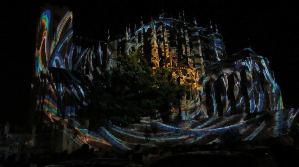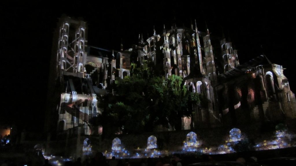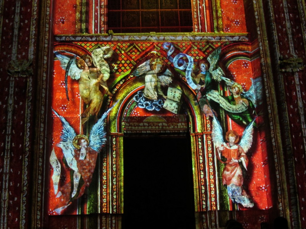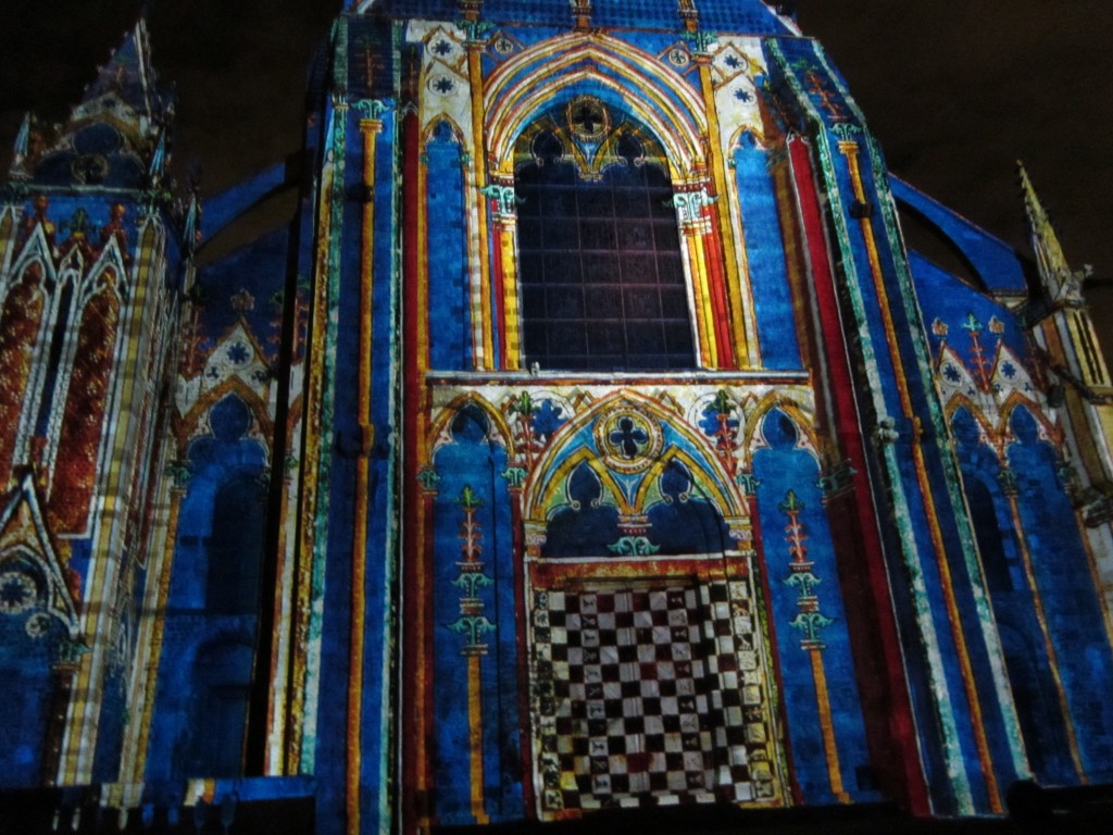 Le soir, nous sommes donc sortis pour admirer les projections sur les monuments. Et le grand changement par rapport à la dernière fois c’était que le chevet était aussi illuminé en plus des autres endroits que nous avions pu voir (la muraille et l’un des portails de la cathédrale avec un petit numéro marrant mettant en scène les anges musiciens peints sur les plafonds). Autant nous avions été épatés par le spectacle de la dernière fois, autant ils ont vraiment mis la barre haute avec cette nouvelle « attraction ». En effet on a droit à un moment de pure féerie avec le monument entier qui semble bouger et s’habiller d’une tenture mouvante qui raconte des histoires, souligne l’architecture gothique ou livre des visions oniriques inspirées (parfois un peu flippantes dans le genre « bienvenue au purgatoire »). L’ensemble, avec musique et transition artistique (dont une vue brouillée qui semble effacer littéralement la cathédrale), est fort réussi et impressionne par sa taille et sa beauté.