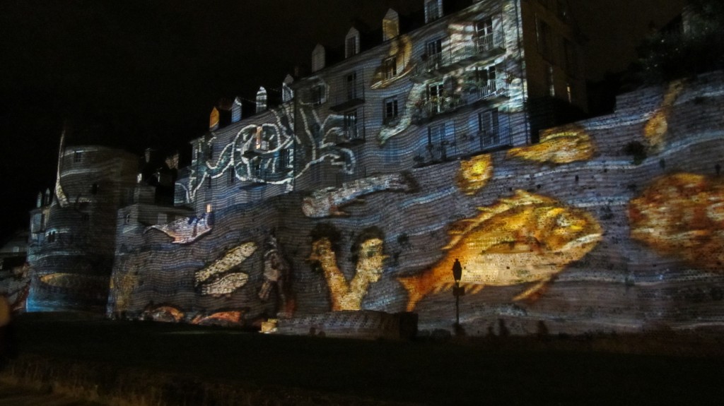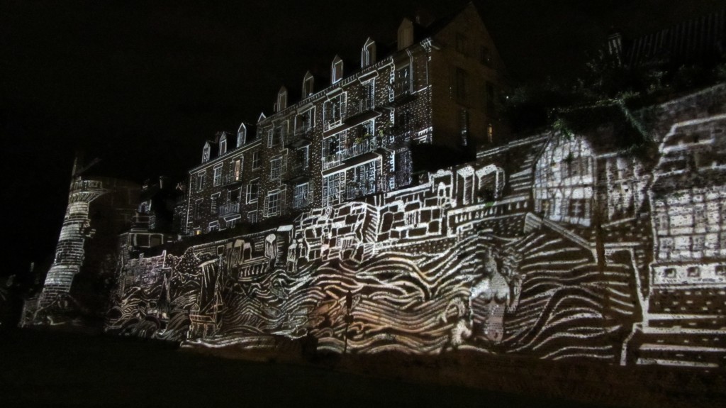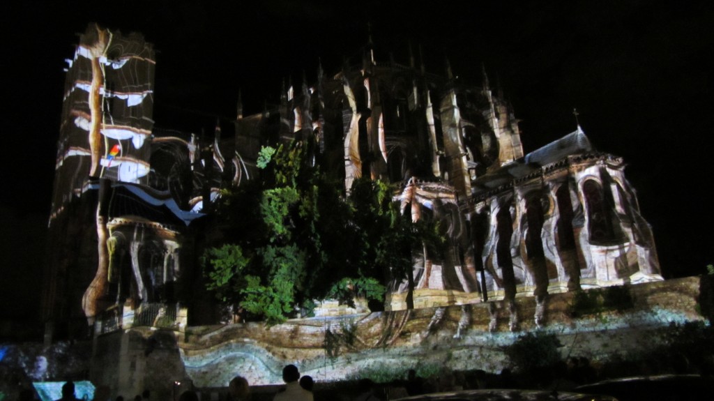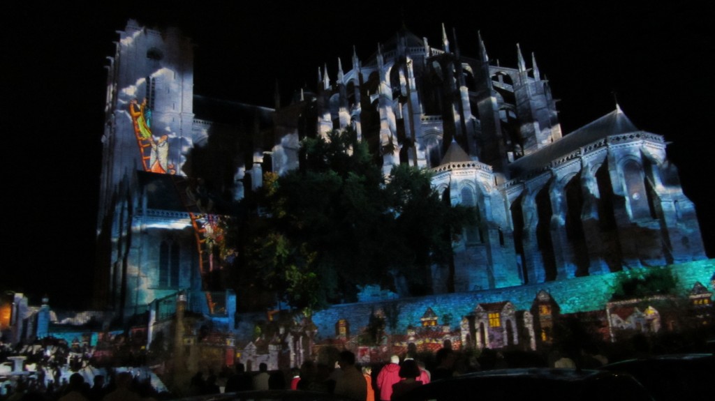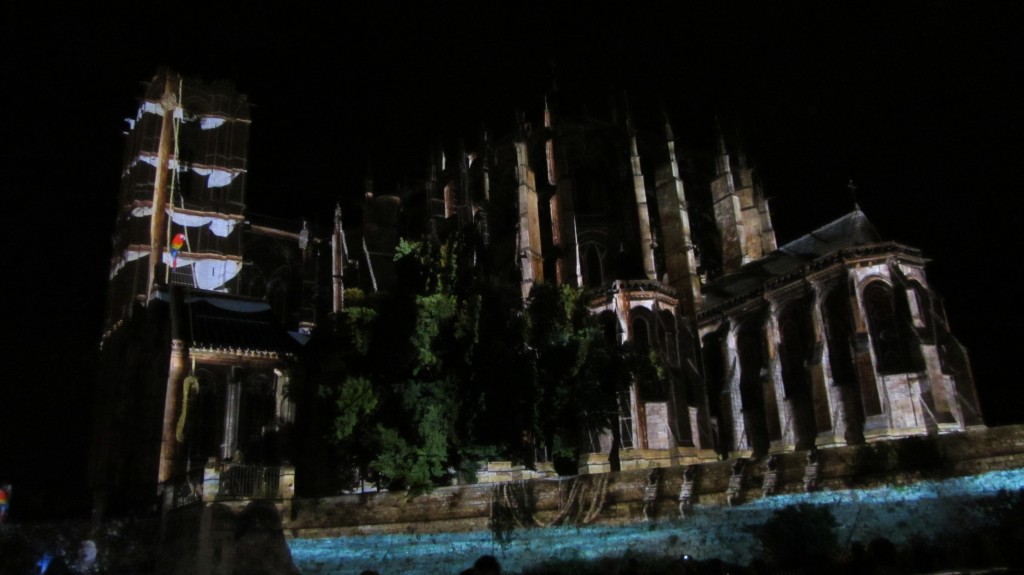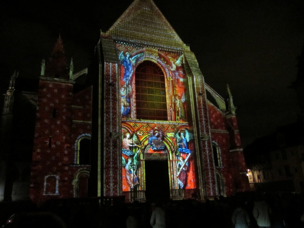Le soir, nous sommes donc sortis pour admirer les projections sur les monuments. Et le grand changement par rapport à la dernière fois c’était que le chevet était aussi illuminé en plus des autres endroits que nous avions pu voir (la muraille et l’un des portails de la cathédrale avec un petit numéro marrant mettant en scène les anges musiciens peints sur les plafonds). Autant nous avions été épatés par le spectacle de la dernière fois, autant ils ont vraiment mis la barre haute avec cette nouvelle « attraction ». En effet on a droit à un moment de pure féerie avec le monument entier qui semble bouger et s’habiller d’une tenture mouvante qui raconte des histoires, souligne l’architecture gothique ou livre des visions oniriques inspirées (parfois un peu flippantes dans le genre « bienvenue au purgatoire »). L’ensemble, avec musique et transition artistique (dont une vue brouillée qui semble effacer littéralement la cathédrale), est fort réussi et impressionne par sa taille et sa beauté.