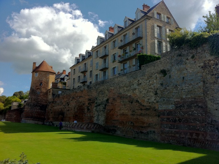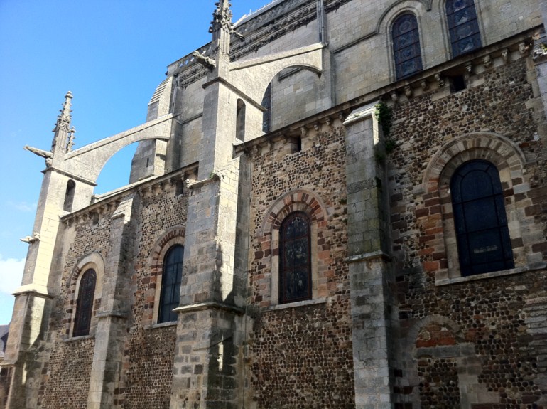C’est drôle car j’ai fait presque les mêmes photos cette fois-ci que quatre ans auparavant, il y a la muraille avec ses impressionnants décors en mosaïques de briques de couleurs différentes, la superbe cathédrale Saint Julien et son immense (et si aérien) chevet, le menhir collé à l’édifice religieux (comme autant de réminiscences des anciens cultes celtes), les maisons attenantes etc. J’ai une grande fascination pour les cathédrales, et c’est amusant comme elles sont parfois magnifiées par des vues sur leurs façades ou au contraire sur leur chevet. Notre Dame de Paris est à mon avis une des uniques cathédrales dont les vues du chevet ou du frontispice sont autant connues, photographiées et distribuées. Saint Julien se démarque complètement par la vue panoramique d’un chevet mis en valeur par une kyrielle d’arc-boutants gothiques de chez gothiques, d’autant plus qu’elle trône ainsi sur une butte dominant toute la région mancelle. On reconnaît aussi dans quelques murs anciens l’utilisation sans scrupule des briques romaines…