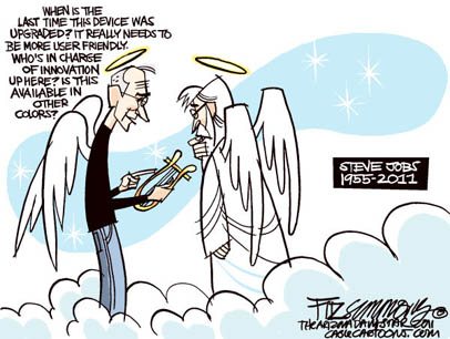 Cette semaine, la mort de Steve Jobs a fait coulé beaucoup d’encre et d’octets, j’ai été frappé de certains témoignages qui faisaient montre d’une émotion un peu disproportionnée, un peu lassé des hagiographies, mais sensibles aussi aux articles de webeux que je connais bien comme François ou Laurent. Donc je préfère ce genre de dessin humoristique [via Elle] qui a le mérite d’être drôle, respectueux et aussi un brin ironique. #stevejobs #mort #apple #blague