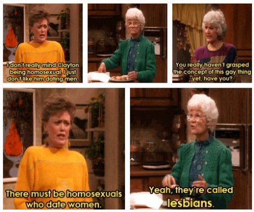 Premier lien pas bien frais en contenu mais tellement bon, avec les Golden Girls, série télé fétiche de mon enfance (merci Alex Taylor sur Continentales) dont les répliques étaient souvent hilarantes. Voilà un extrait (en gif animé sur le tumblr lié ci-après) [via Anceps] très gay-friendly (comme la série) et représentatif de l’humour qui y était distillé. #gay #humour #sérieTV #années80
