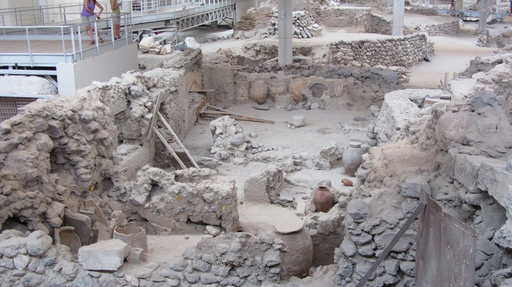 Il s’agit donc d’un grand espace moderne qui recouvre des zones de fouilles où les archéologues excavent cette fascinante ville du néolithique d’une large épaisseur de pierres ponces et cendres volcaniques. Les objets sont parfois intacts, ou comme à Pompéi dès qu’on trouve un creux, on y coule une résine et on peut reconstituer des éléments (comme des meubles en bois) détruits par la catastrophe. Il s’agit d’une ville figée à un moment donné et donc le chemin des rues est parfaitement conservé, ainsi que tous les bâtiments.