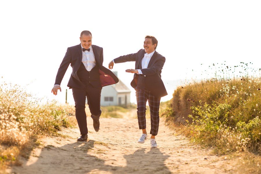 Evidemment les derniers essayages de mon costume sur mesure à Paris ont révélé une grosse erreur technique, et mon pantalon était bon à refaire. Du coup je suis parti avec un pantalon trop serré, et j’ai récupéré le bon fute… le jour du mariage ! On avait prévu de faire les photos le jour où la météo serait la meilleure avant le jour J. C’était un moment marrant ça aussi avec un photographe très cool, mais un peu largué. Il a d’abord tenté de nous faire faire les trucs dont il avait l’habitude mais il a vite avoué : « Bon, en fait ça marche bien avec un garçon et une fille, mais c’est pas terrible avec deux mecs, il faut innover !! ». On est allé dans les endroits qu’on aime bien vers Clohars et au bord de l’océan, et on a eu au final quelques clichés assez sympas, dont celui qui orne l’article.