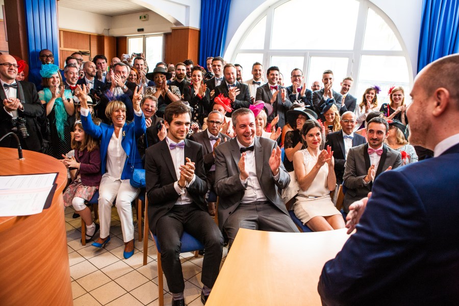 L’adjoint qui nous a marié a été adorable, et a fait un très beau discours. C’était surtout épatant de voir tout le monde rassemblé et serré débout dans cette minuscule mairie. Nous faisions face à l’assemblée ce qui est assez rare, et on a pu profiter (et réciproquement) des émotions qui passaient sur les visages de chacun.