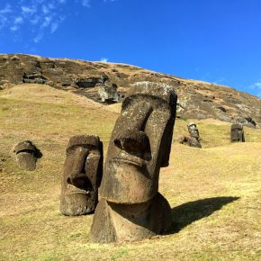 Et la dernière semaine, c’était un prochain passage à Santiago pour reprendre l’avion pour 5 heures avant d’atterrir sur l’endroit le plus isolé de notre planète : l’Île de Pâques. C’est vraiment quelque chose cette île, ce caillou de 160 km2 (23km pour la plus grande longueur), complètement perdu au milieu du Pacifique, et au patrimoine époustouflant avec un millier de ces statues géantes plus ou moins en ruine. Evidemment l’île est connue pour cela, mais déjà on ignorait qu’il en existait tant, mais j’ai adoré en savoir plus sur son histoire et ses coutumes. Rapa Nui est à 3 680 km de Santiago du Chili et à 4 050 km de Tahiti, et ce sont les endroits les plus « proches ».