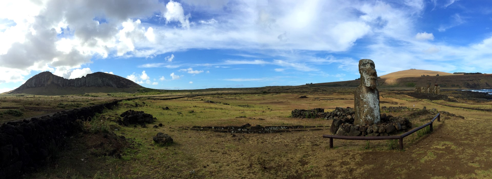 Les moaïs ont à priori été érigés entre 1250 et 1500 de notre ère, donc ce n’est pas si ancien ! Et un jour, hop, tout s’est arrêté. Les moaïs ont été poussés par terre, parfois brisés, et remplacés par le culte de l’homme-oiseau. Donc la remise en état des statues et leurs érections est quelque chose de très contemporain. On trouve des statues sur tout le pourtour de l’île, le regard vers les villages en protection (et donc la plupart du temps dos au rivage). Les toutes premières restaurations sont à la fois le signe de statues très abîmées et peu habilement recollées, ou carrément des recréations parfaitement contemporaines qui ont le mérite de montrer des exemples de moaïs « fonctionnels ». On voit cela avec Ahu Tahai par exemple :