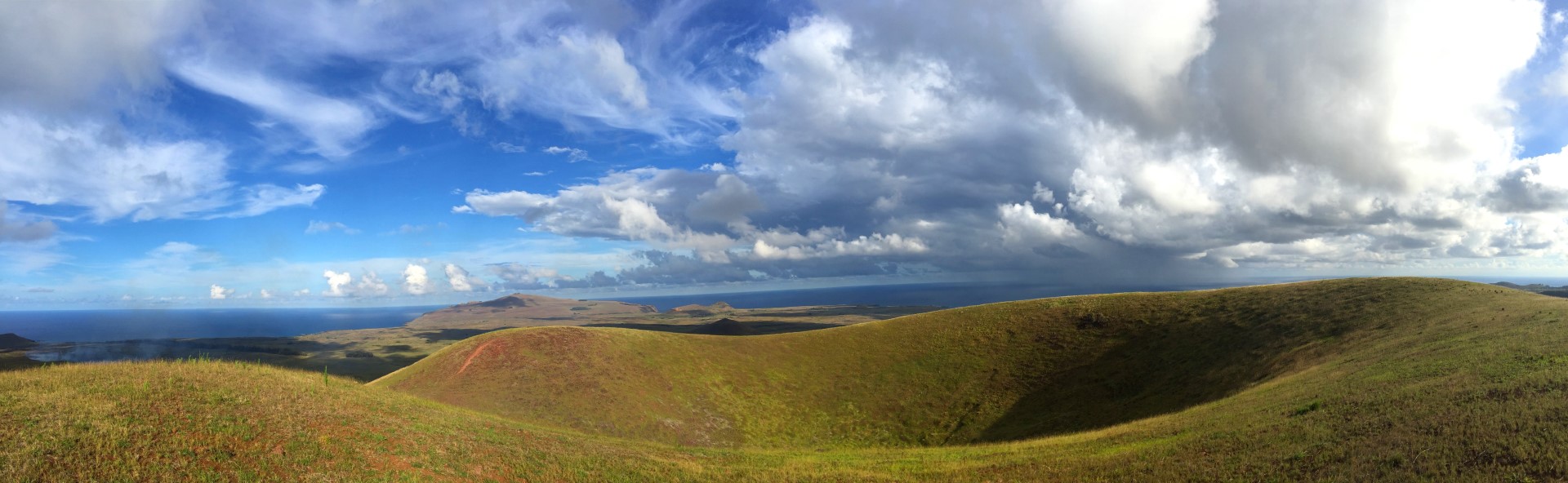 L’Île de Pâques est un amoncellement de volcans plus ou moins éteints, et cela se voit dans les paysages, avec un côté Auvergne miniature assez drôle lorsqu’on grimpe aux sommets de ces cônes aujourd’hui verdoyants.