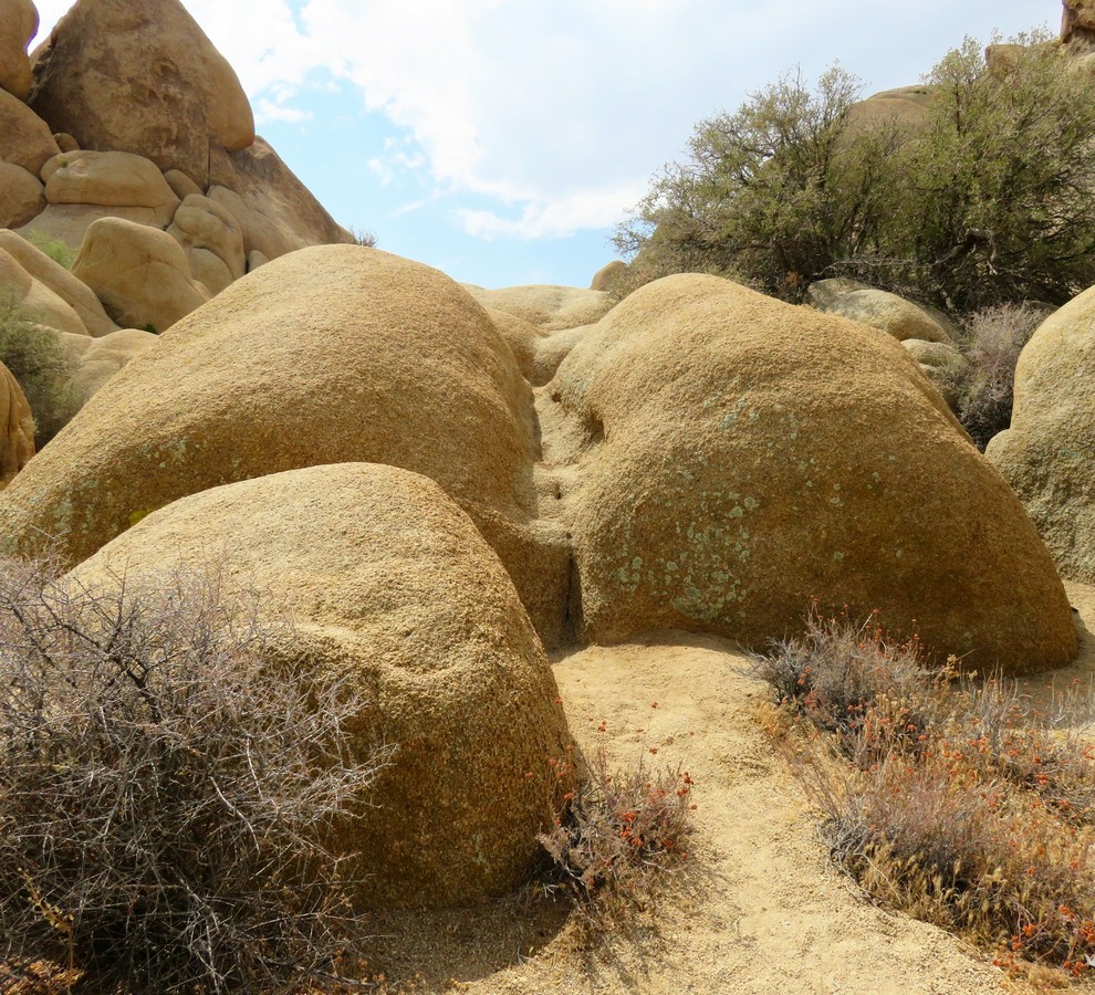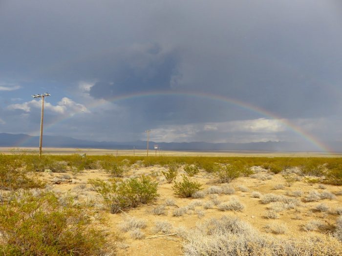 On est souvent passé par le fameux désert du Mojave qui est toujours l’occasion de ces longues et interminables lignes droites d’asphalte sur décor de western spaghetti. La route 66 d’ailleurs traverse cette zone semi-désertique. Mais là on s’y est un peu attardé, et j’ai surtout été marqué par l’impact incroyable de la pluie dans cet environnement normalement si aride. D’ailleurs c’est une des grosses différences avec notre voyage de 2009 qui s’était passé dans une atmosphère très très sèche. Là il avait flotté il y a quelques jours, et les orages menaçaient encore carrément. On n’y a d’ailleurs pas échappé avec un très beau déluge de quelques dizaines de minutes qui a suffit à recouvrir des routes et nous faire un peu flipper lors de franchissement de rivières improvisées. La nature change alors immédiatement, les Joshua Trees verdissent, les cactus fleurissent, et globalement on sent une bouffée vitale pour une flore et une faune qui profitent de cette unique occasion annuelle pour faire le plein d’hydratation.