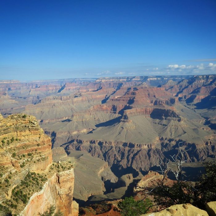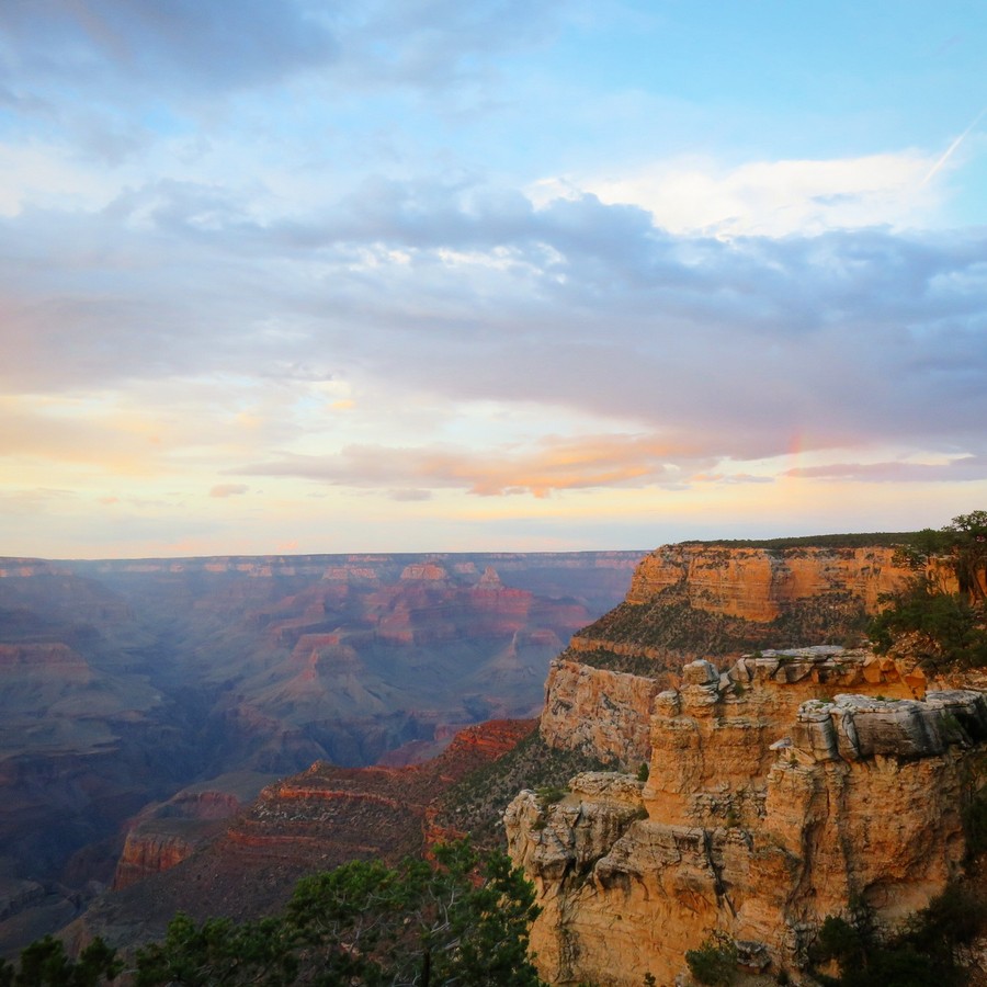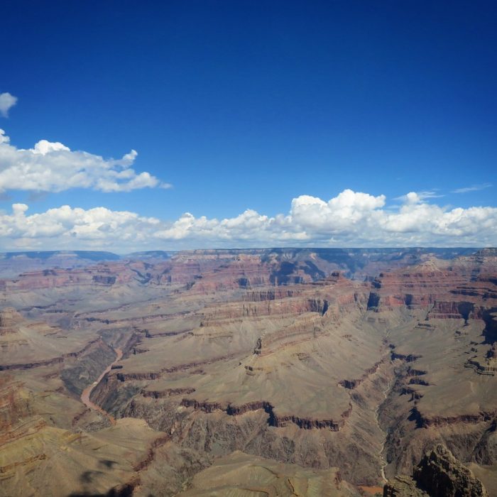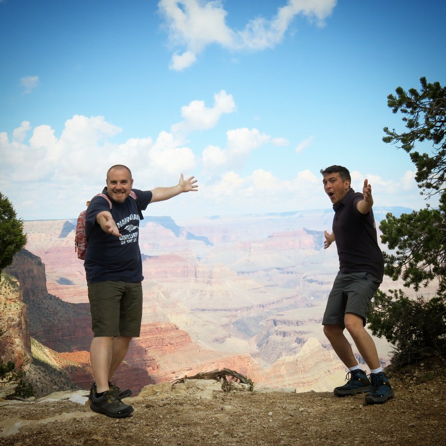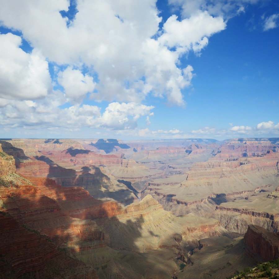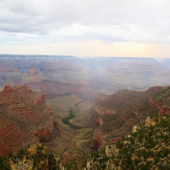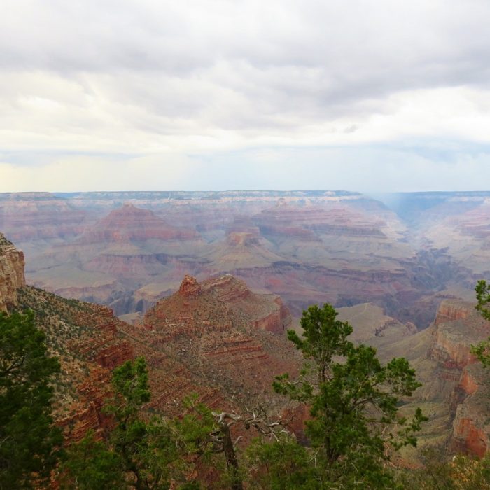C’était ma troisième fois au Grand Canyon, et on a beau en avoir des souvenirs, on a beau de dire qu’on se souvient de ce que ça fait, eh bien non, c’est toujours le même souffle épique, toujours la même impression dévorante lorsqu’on arrive au bord du précipice. L’orage nous suivait encore un peu (on a eu de la flotte à Las Vegas, ce qui est plutôt exceptionnel !) avant de complètement nous quitter, et le premier jour a été un peu couvert. Mais le Grand Canyon est magnifique par tous les temps, dans toutes les conditions atmosphériques. Quand on est arrivé, la pluie venait de cesser, et cela donnait ça :