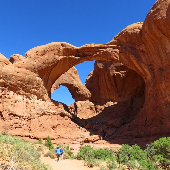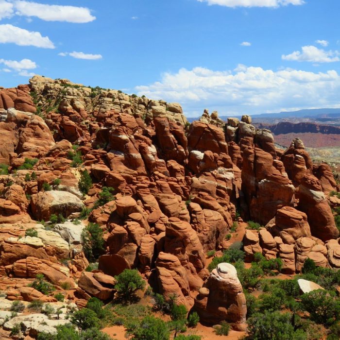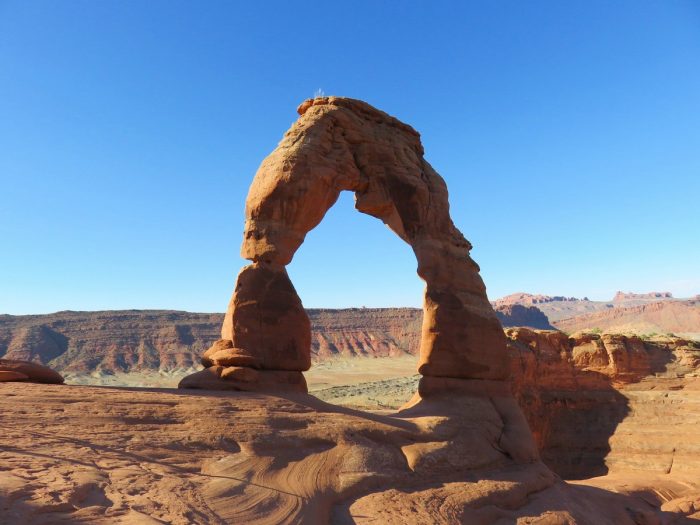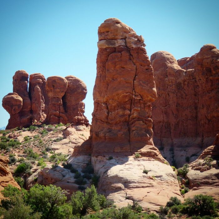 Sans le plus impressionnant et donc le plus fréquenté des « petits » parcs, et on le comprend aisément. Arches est un concentré des différents parcs d’Utah. On va y retrouver un peu de Monument Valley, de Zion, de Bryce, mais aussi ce qui en fait sa renommée et son « toponyme » c’est-à-dire les arches naturelles. On a repris les bonnes habitudes et on a débarqué tôt le matin pour profiter d’un parc un peu plus calme, et d’une lumière fabuleuse notamment sur Delicate Arch (dont il faut mériter le point de vue en marchant quelques heures un peu difficilement). On ne reste jamais assez longtemps dans ce parc, il le faudra une prochaine fois pour prendre le temps de quelques randonnées qui promettent des points de vue et des concrétions qui ne sont pas accessibles autrement. Je ne me lasse pas des formes étranges que l’érosion sculpte, et qui font largement flâner notre imagination.