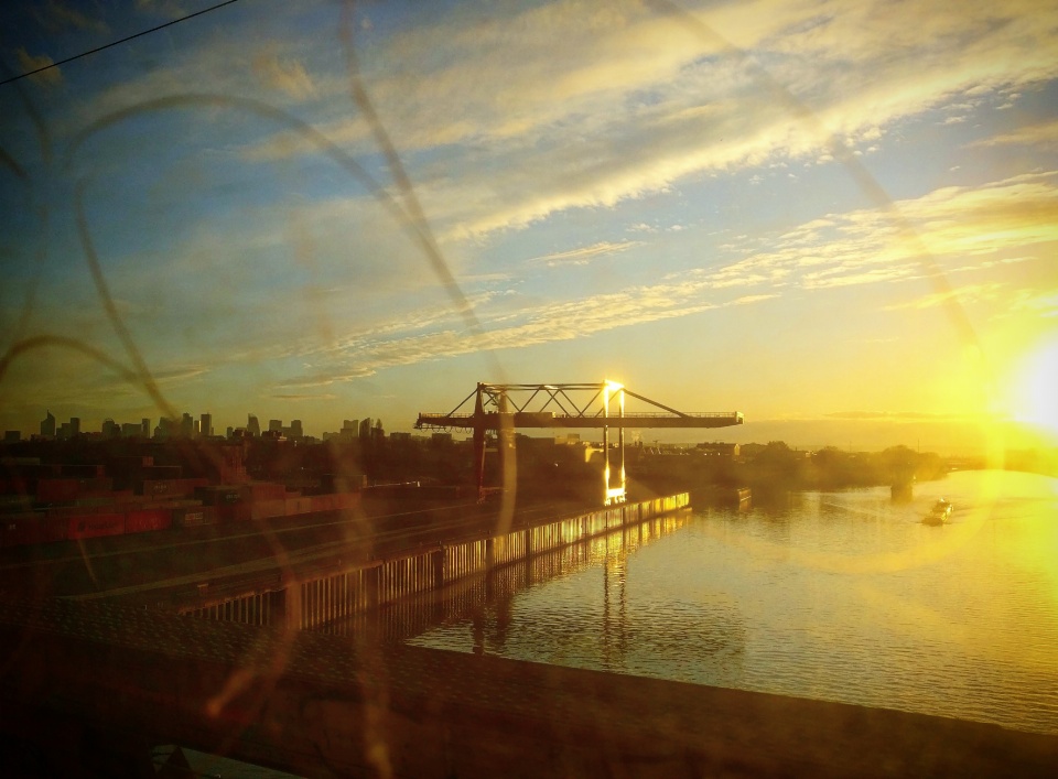 Traverser la Seine, vue sur le port de Gennevilliers, La Défense au loin, à travers une vitre d’un train de banlieue qui a bien souffert. ;) #romancetransilienne
