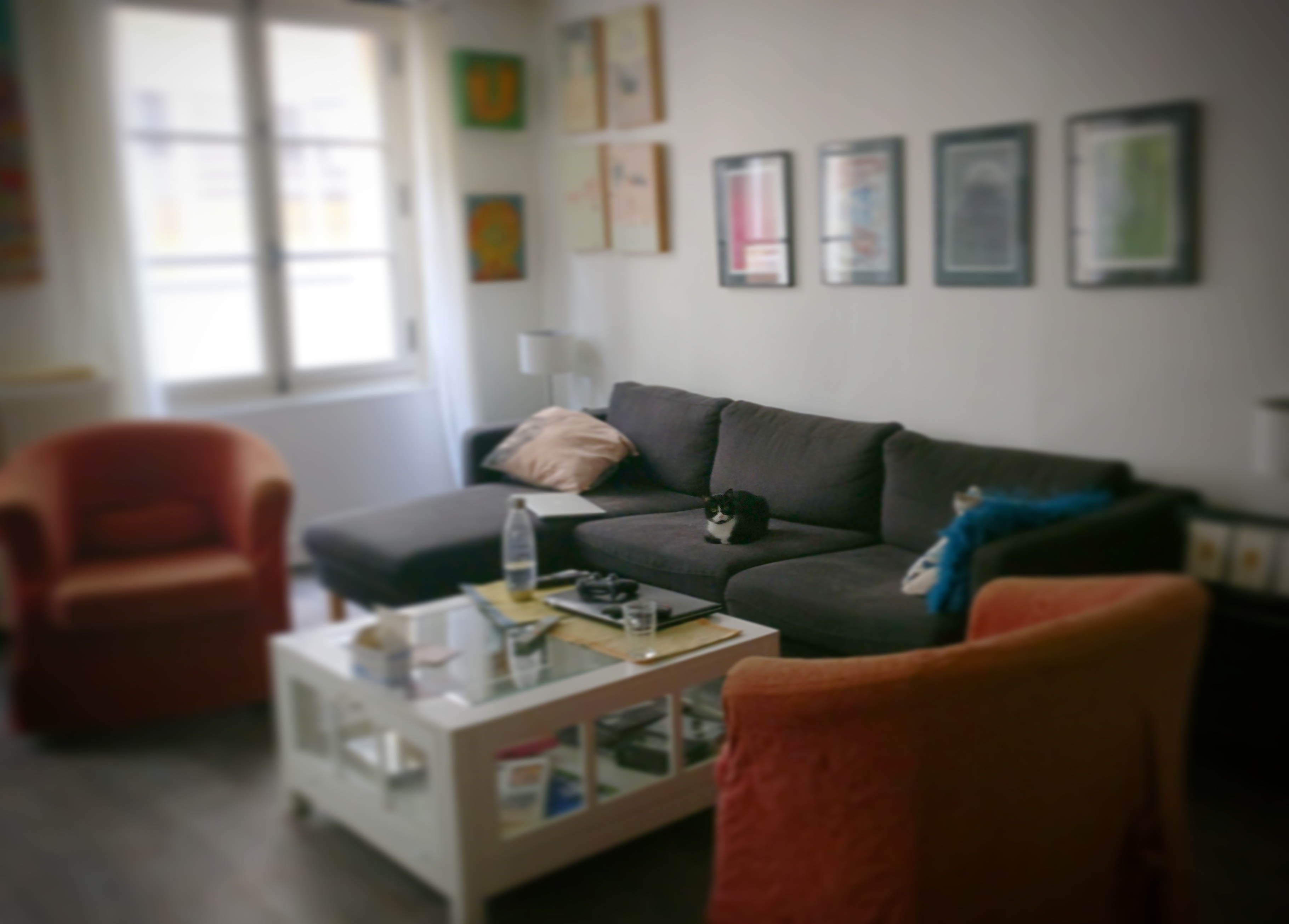 Sookie tous les matins quand je quitte l’appartement, au milieu du canapé, qui me juge. :))