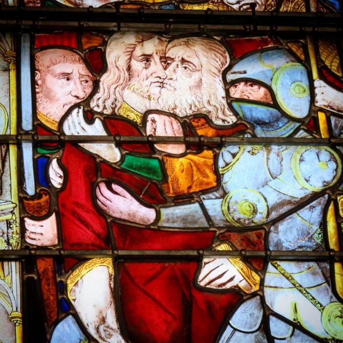 Avec ce beau soleil dehors, et le fait que ce soit une belle architecture de style gothique tardif, avec ces ouvertures majestueuses et la lumière en plus de la hauteur de la nef, on obtient une sacrée allure intérieure. J’ai tout de même trouvé assez « drôle » ce détail de vitrail qui m’a fait penser à une attaque homophobe en pleine Gay Pride, alors que c’est évidemment le fameux baiser de Judas. Mais j’ai trouvé des tas de légendes et j’aurais aimé que Jehan m’en trouve de plus sympathiques encore.