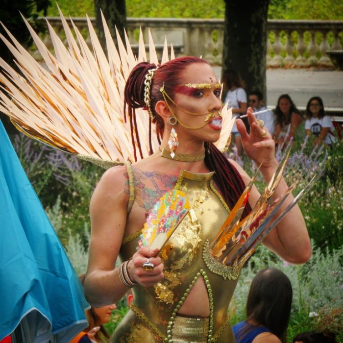 Je n’ai jamais parlé des Paillettes, c’est un collectif de Drag Queens parisiennes que j’aime beaucoup. Elles présentent régulièrement des shows reprenant le rôle de certaines drags militantes, avec par exemple des lectures de textes queers et féministes sur des thèmes donnés. Il y a aussi évidemment un peu d’humour potache et des splendides tenues, improbables perruques et maquillages extravagants pour couronner le tout. Pour la Pride, elles ont présenté un show génial « Des Paillettes dans la Capote » avec quelques Soeurs de la Perpétuelle Indulgence.