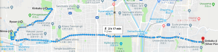 J’ai fait le lendemain le grand classique de Kyoto avec un chemin bien connu qui mène d’un des chef-d’oeuvre à l’autre de la ville. C’est à dire du Temple d’Or (Kinkaku-ji) au Temple d’Argent (Ginkaku-ji), et le trajet est parsemé d’une kyrielle de temples, jardins et sanctuaires de religions différentes. J’ai précisé les quelques arrêts qui sont décrits plus bas, et que j’ai beaucoup aimé. De toute façon, j’ai à peu près tout aimé vu que tout est superbe.