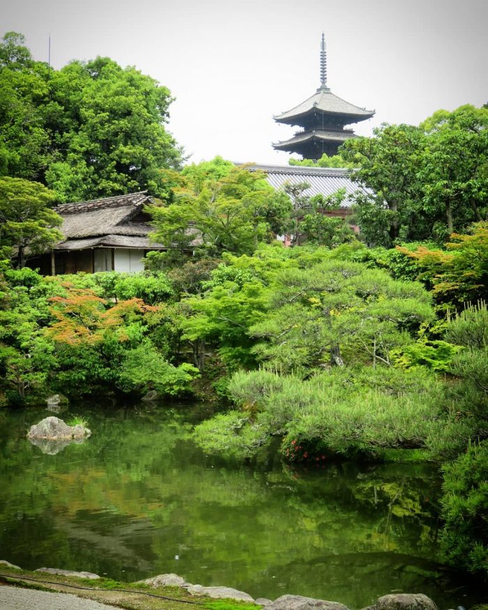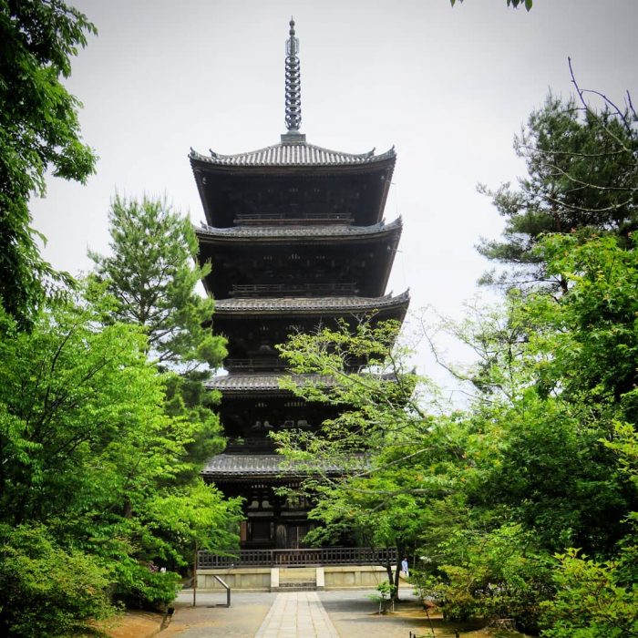On bifurque de l’autre côté de l’édifice principal et là bammm, on est plongé dans une vision enchanteresse de verdure et d’un temple à étages (un tō, une pagode) qui complète merveilleusement le paysage.