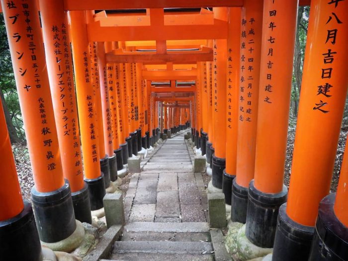 Il y a aussi pas mal de chats qui se baladent et qui ont l’air de trouver de quoi subsister parmi les offrandes et les torii (comme vous pouvez voir, de toutes les tailles !!).