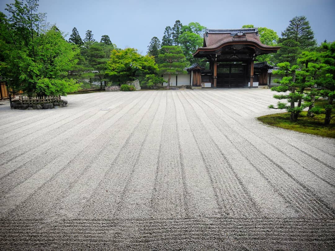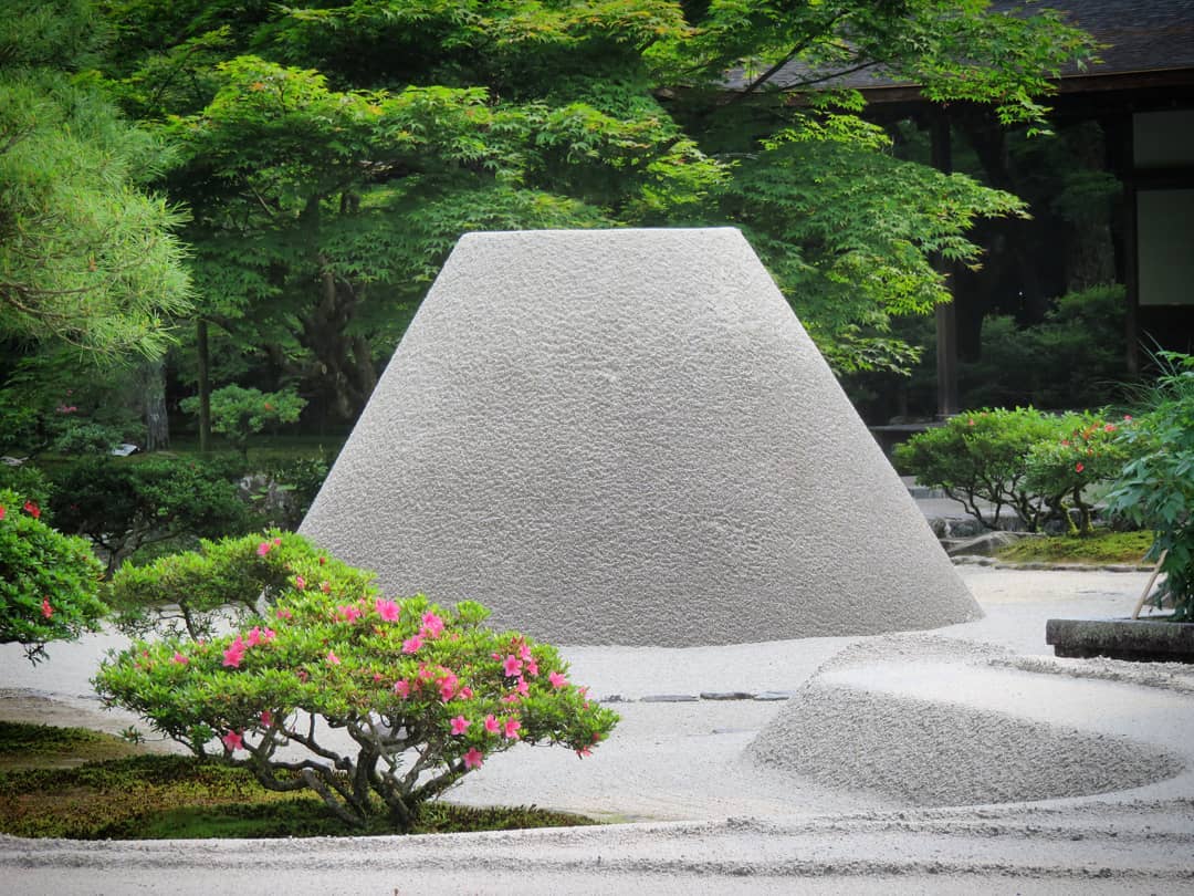 Enfin le Pavillon d’Argent ou Ginkaku-ji est étonnant car il est tout à la fin du parcours, et il n’a rien « d’argent ». En revanche, c’est sans doute le plus beau jardin de Kyoto, et il dégage une harmonie assez extraordinaire tout en concentrant tous les gimmicks du jardin nippon. On y trouve notamment le Kō getsudai, un tas de sable qui représente le mont Fuji :