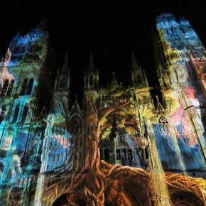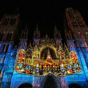 J’avais dit que je retournerai à Rouen avec chérichou, c’est donc fait ! J’ai profité d’avoir encore jusque fin septembre pour découvrir le spectacle quotidien d’illumination de la cathédrale. Comme au St Julien au Mans ou St Corentin à Quimper, ou à bien d’autres endroits aujourd’hui, Rouen propose un spectacle nocturne tous les étés avec de chouettes projections vidéos sur la façade de son immense cathédrale gothique.