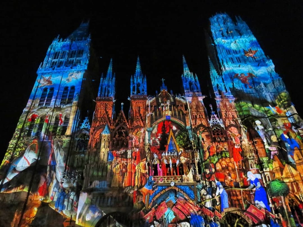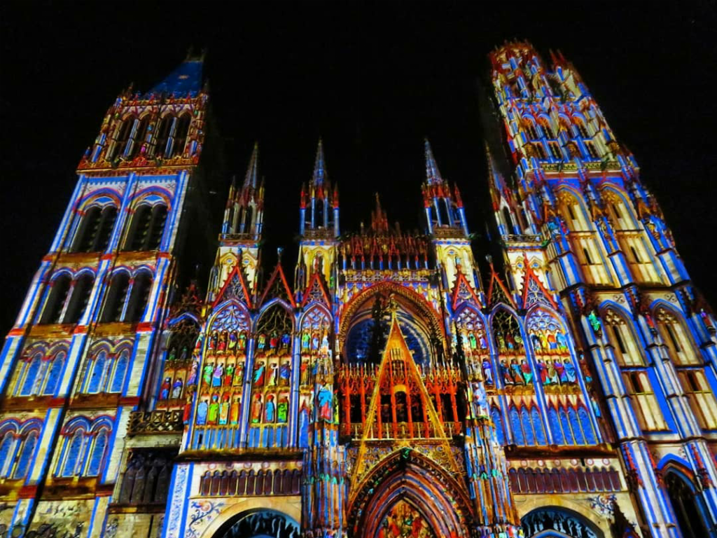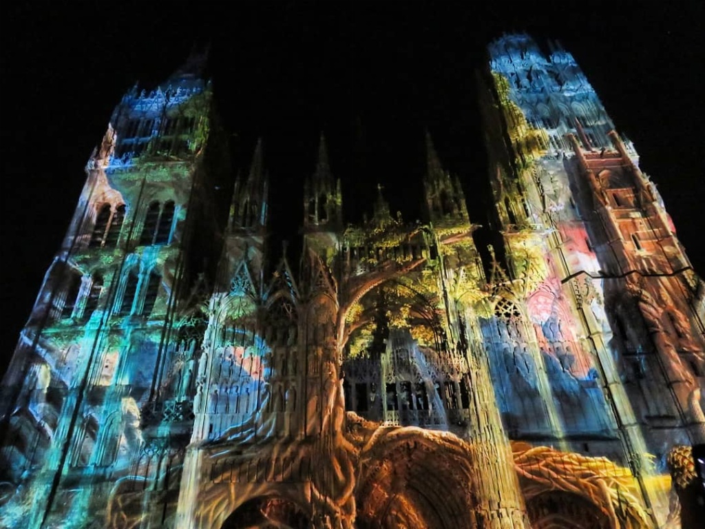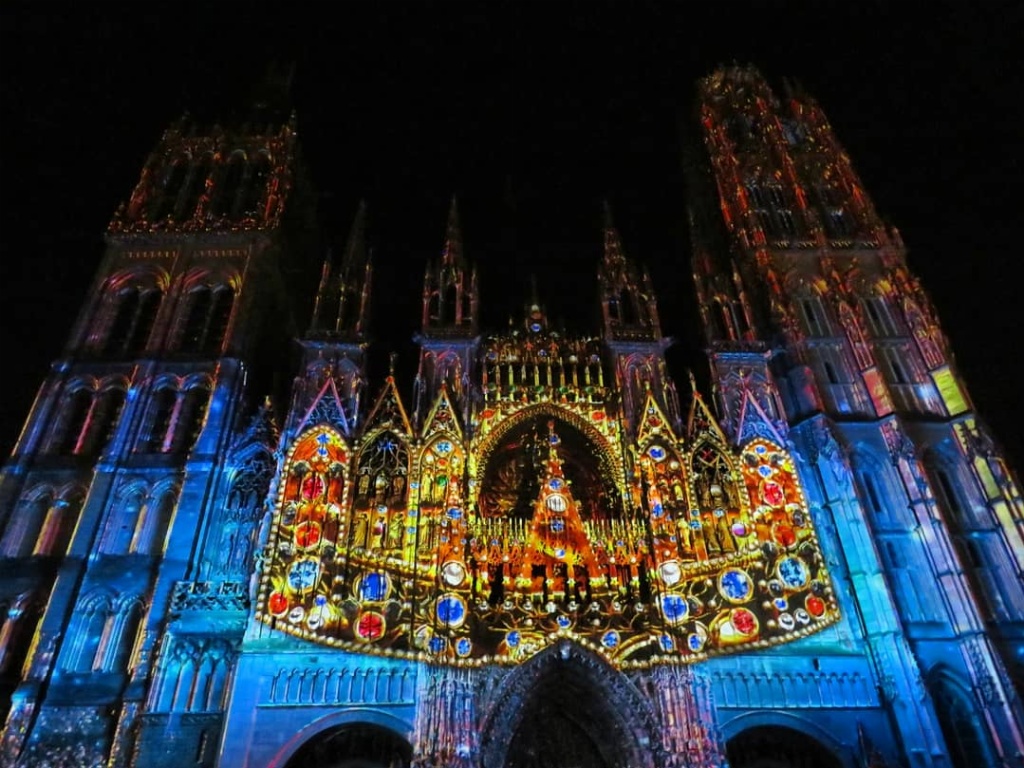 J’avais dit que je retournerai à Rouen avec chérichou, c’est donc fait ! J’ai profité d’avoir encore jusque fin septembre pour découvrir le spectacle quotidien d’illumination de la cathédrale. Comme au St Julien au Mans ou St Corentin à Quimper, ou à bien d’autres endroits aujourd’hui, Rouen propose un spectacle nocturne tous les étés avec de chouettes projections vidéos sur la façade de son immense cathédrale gothique.