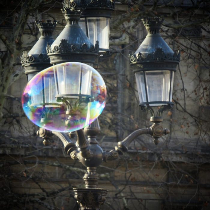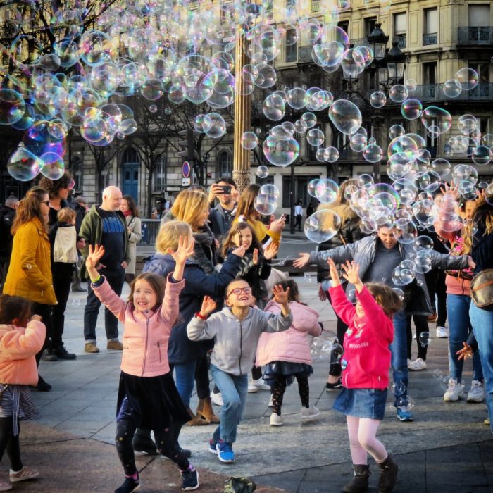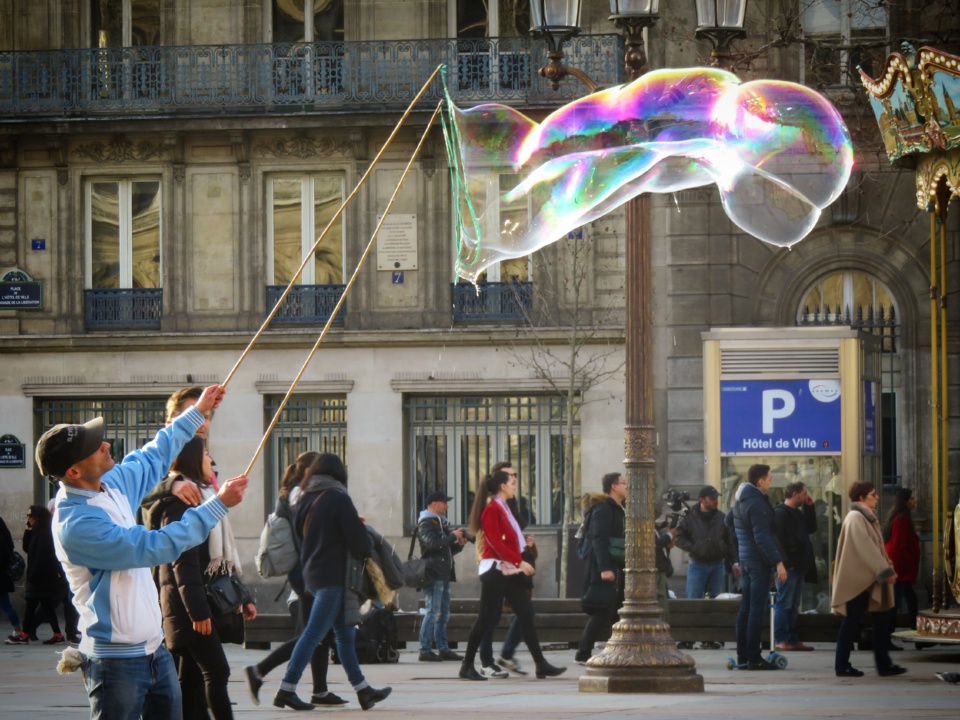 En me promenant vers le parvis de l’Hôtel de Ville, j’ai vu que deux faiseurs de bulles avaient leur cour de gamins qui virevoltaient autour en cherchant à éclater les bulles multicolores. Il y avait les deux styles aux deux extrémités de la place, d’un côté les bulles géantes et filiformes qui se développent en immenses béhémoths iridescents, de l’autre des kyrielles de petites bulles formant un champs immense.