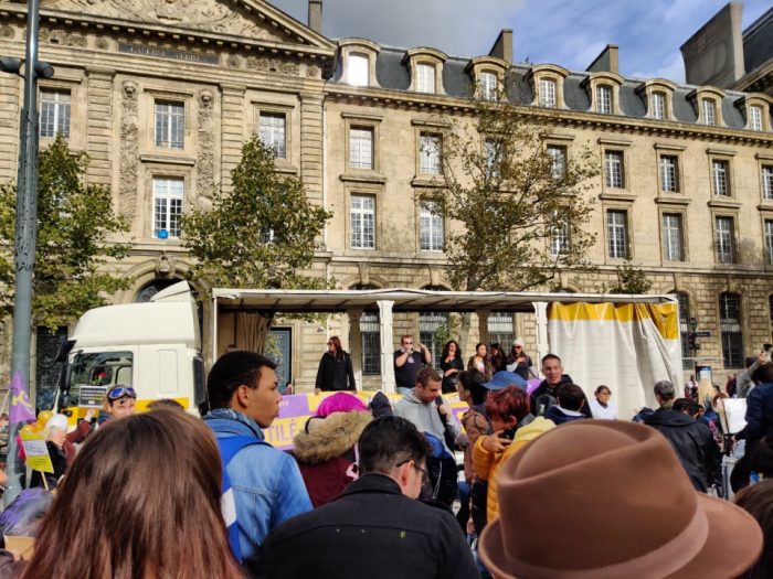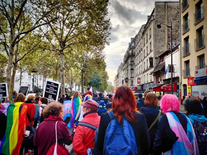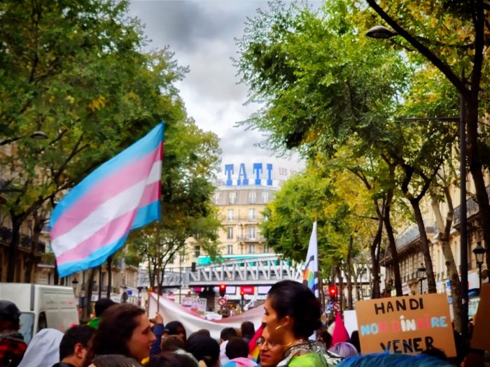 Le moins drôle, alors que les pancartes politiques célébrant l’intersectionnalité des luttes fleurissaient dans le défilé, ce fut le passage à Barbès-Rochechouart. Il y a toujours des bandes qui traînent dans le coin pour vendre des cloppes à la sauvette, et généralement c’est une zone un peu « chaude » (sans dramatiser non plus). On n’a pas échappé aux insultes et quolibets, à des remarques horribles sur des trans ou des questions (« Hey t’es un mec ou une meuf ? ») qui n’étaient qu’une autre manière de provoquer et lancer des méchancetés. Je me disais que c’était bien là que s’arrêtait une certaine conception de l’intersectionnalité justement, même si c’est un concept qui me parle beaucoup.