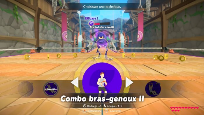 Quand mon chéri a acheté la souitche, et que j’ai vu la pub pour ce jeu qui proposait de faire du sport avec un anneau flexible, j’ai voulu tester. Ce qui est marrant c’est qu’il faut utiliser les deux manettes détachables et les fixer, l’une à une cuisse avec un bandeau élastique, et l’autre sur l’anneau. Et ça détecte étonnamment bien les gestes qu’on fait, ce qui permet de suivre sur l’écran un personnage qui se comporte exactement comme le joueur harnaché chez lui.