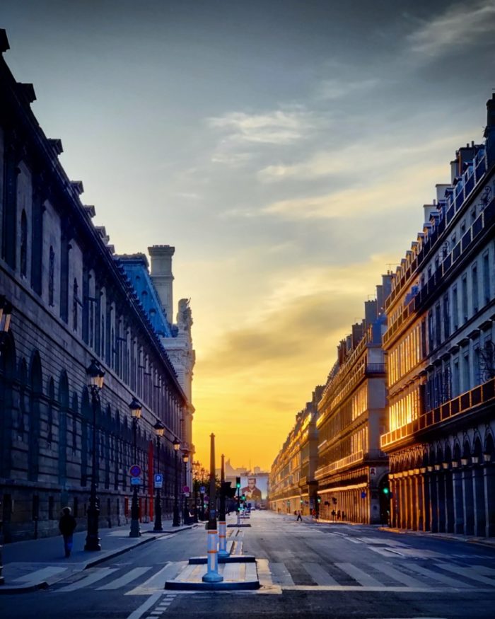 En même temps ce n’était pas tant que cela une ambiance apocalyptique, mais plutôt une douce soirée printanière au ciel immaculé, qui commençait tout juste à prendre des tons d’or. Et cette absence de foule, car ce n’est pas normalement quelques personnes, mais toujours des centaines de badauds dans ce coin, a un effet terriblement apaisant. En traversant la rue de Rivoli, les rayons du soleil dardaient déjà contre le côté pair de la célèbre rue aux arcades. Le contraste entre les deux enfilades de façades est superbe, et l’absence de voiture est exceptionnelle. Le seul hic c’est cette publicité géante à l’autre bout de la rue, comme beaucoup de ces réclames qui défigurent une bonne partie des monuments parisiens en réfection (et payent une partie des travaux… ¯\_(ツ)_/¯).