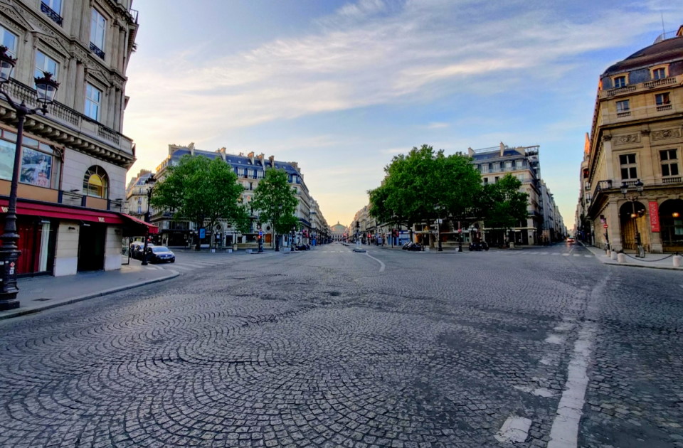 Allez, 1,3 km au lieu de 1 km, ce n’est pas la mort si ? Eh bien, on s’est dit que ça passerait pour une première entorse, et une seconde dérogation pour « promenade ». Et quand je vois la photo au-dessus, je n’ai aucun regret, c’était incroyablement beau. Déjà, comme vous l’imaginez sans doute, il n’y avait pas grand monde. Par exemple, l’avenue de l’Opéra que l’on traverse en dehors des clous, et sans faire bien attention à la voiture au loin.