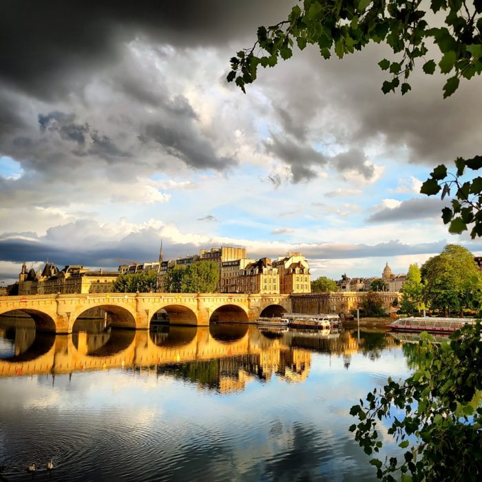 Après avoir vu les Tuileries au coucher du soleil, on a voulu aussi jeter un coup d’œil à la Seine, et là on a juste fait un grand tour pendant notre heure de promenade. Toujours au coucher du soleil, car c’est en gros l’heure du dîner et que les gens n’ont aucune autre sortie possible que chez eux ! Du Sentier, on a remonté la rue du Louvre et en laissant la cour carrée à notre droite, on est arrivé à la Seine. En remontant vers la Samaritaine, j’étais un peu halluciné par la douceur de l’air, le doré du soleil couchant, et j’ai réalisé que la Seine n’avait jamais été aussi calme et plate. Pas une onde provoquée par une bourrasque ou les innombrables bateaux-mouches ou péniches qui habituellement soulèvent les tonnes de vase du fond du fleuve. Et donc il s’agissait du plus incroyable miroir pour le plus ancien et le plus beau des ponts de Paris : le Pont-Neuf.