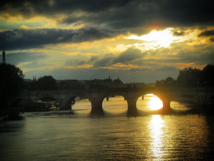 Nous sommes ensuite remontés vers Châtelet, où un coup d’œil vers l’autre côté du Pont-Neuf et du soleil couchant se passe de commentaire.