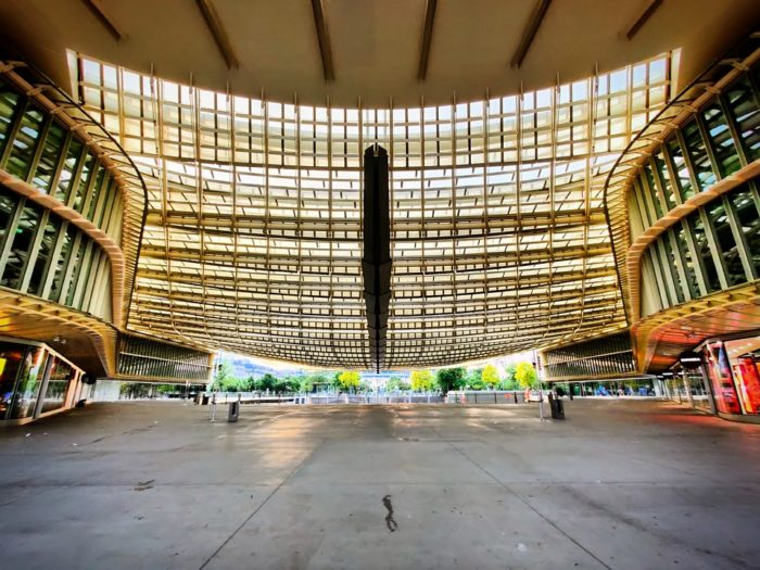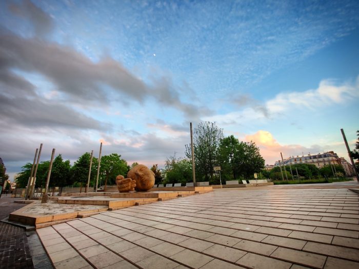 On l’aperçoit déjà par la Canopée, le jardin Nelson Mandela, l’église Saint Eustache et la toute récemment rénovée Bourse du Commerce (et sa Colonne Médicis attenante, bien plus ancienne). Il y avait quelques badauds promenant leur chien et quelques joggeurs du dimanche soir. On imagine moins qu’il y avait aussi un type torse nu, manifestement fou, qui avait une barre en fer dans la main, et qui tapait sur tout ce lui lui tombait dessus. Il a cassé des vitres de mobiliers urbains du jardin, et a fait peur aux quelques promeneurs. Pour tout arranger, quelques caille-ras du coin lui ont jeté des pavés pour l’énerver et se moquer de lui. S’en est donc suivie une course poursuite impitoyable et pathétique, avec des coups de barre de fer sur des vélos, et des échauffourées dont on a choisi de s’éloigner. Bref même en temps de confinement, rien ne change aux Halles. Arf arf.