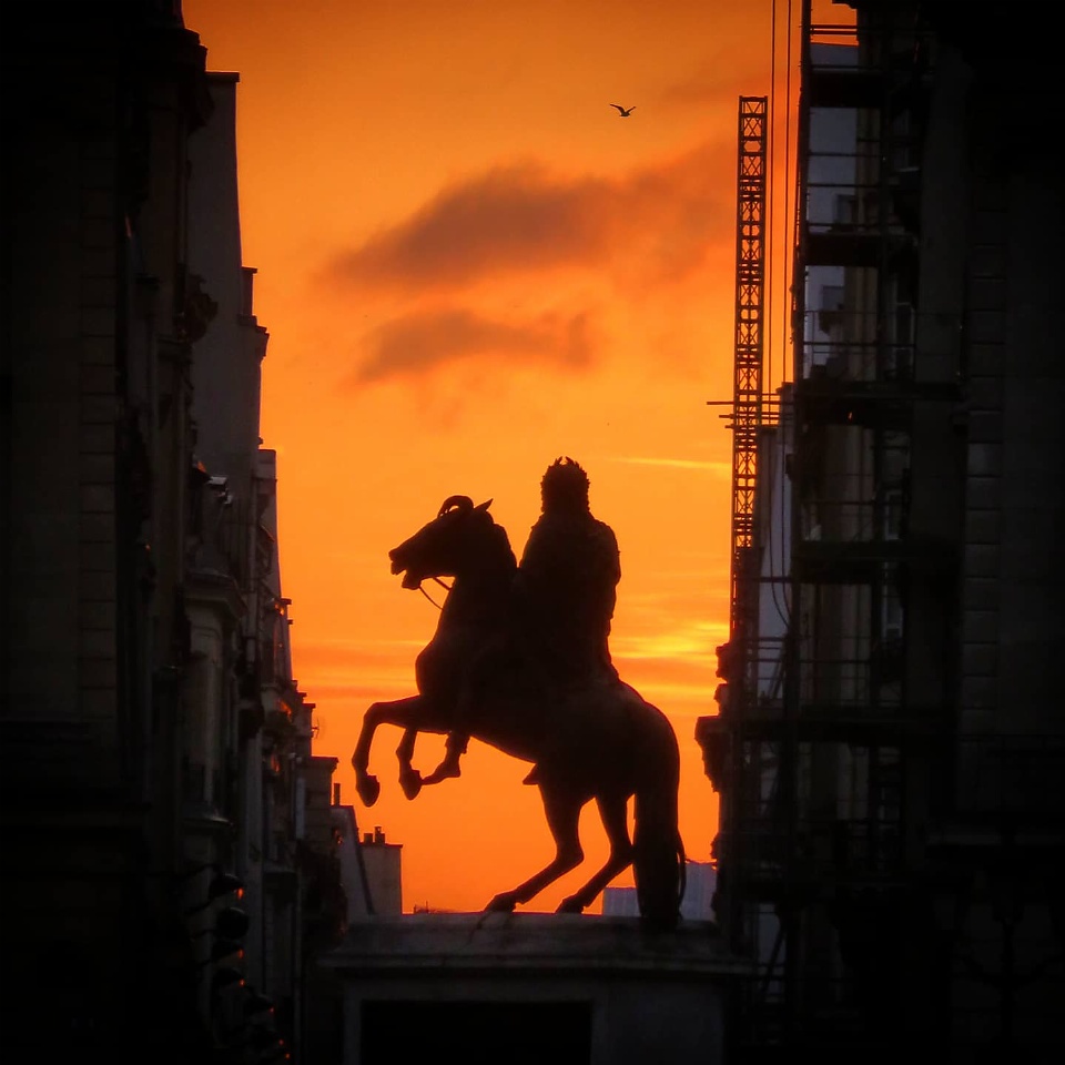 Cinq minutes plus tard, on traversait la rue Etienne Marcel pour rejoindre notre quartier. Et là dans l’alignement parfait avec la place des Victoires et la statue équestre de Louis XIV, on imaginait le soleil parfaitement couché, mais encore irradiant les cieux de rose et d’orangé. Un petit coup de zoom, et l’illusion est parfaite, le cheval et son royal jockey se découpent parfaitement sur ce ciel parisien si rare.