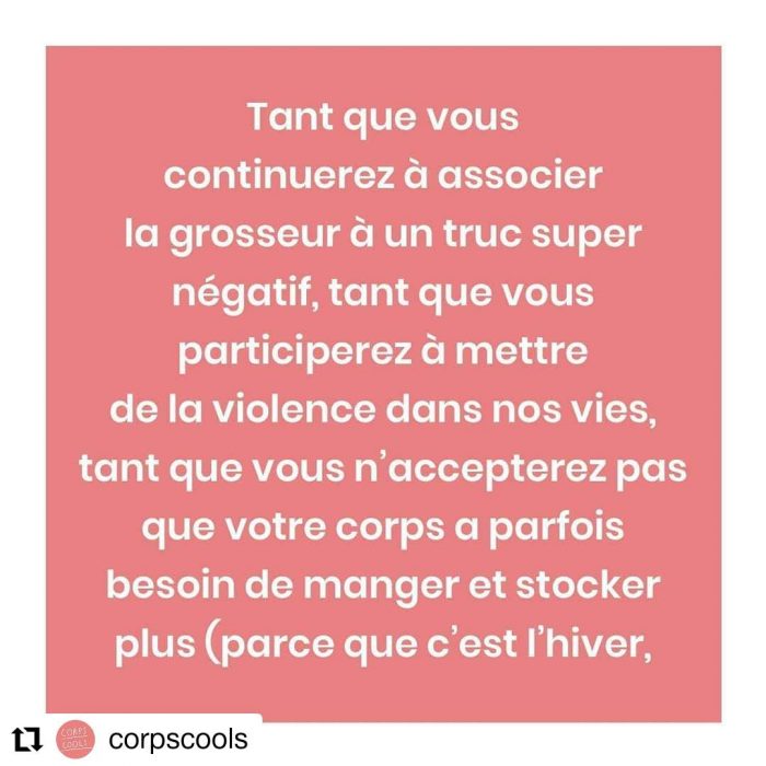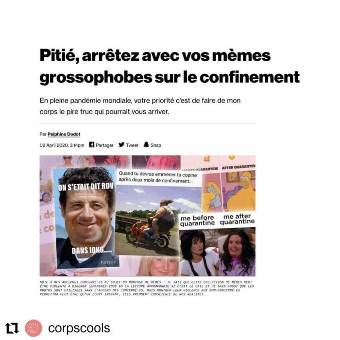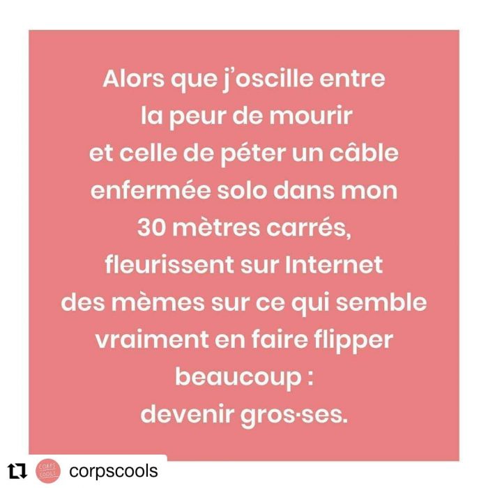 J’ai vu ce post sur Instagram dont je vous ai mis les différentes vignettes. J’ai été particulièrement marqué par cette publication que je considère comme un véritable manifeste anti-grossophobe, et quelque chose qui m’a paru vraiment important. Car pendant le confinement, j’ai aussi d’abord souri puis été assez abasourdi par le flot ininterrompu de mèmes sur ce thème. Entre ça et les accros au sport qui devenaient fous, et un peu aussi un mélange des deux puisque le salut du gros, et sa sacro-sainte rédemption, passe forcément par la foi orthodoxe et intégriste dans le sport.