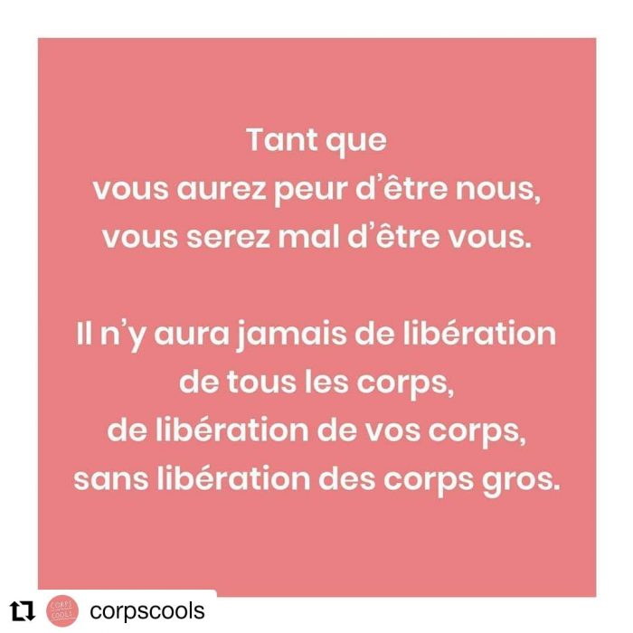 Et il s’agit avant tout de lutter contre l’opprobre qu’on a tous connu très banalement depuis l’école, que ce soit en tant qu’acteur, spectateur ou victime. Mais aussi contre pas mal de clichés colportés et qui sont bien cités et argumentés dans le manifeste plus haut. Cela ne remet pas en question les gens bien dans leur peau qui se réjouissent d’avoir perdu mille kilos ou d’être devenu enfin beau dans leur miroir. Chacun doit trouver son chemin, son équilibre et son bonheur. Mais peut-être que sans cette grossophobie sociétale organisée et banalisée, il y aurait moins de tristesse et de mal-être, et plus de reflets sereins dans nos miroirs.