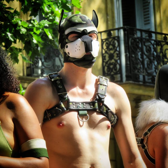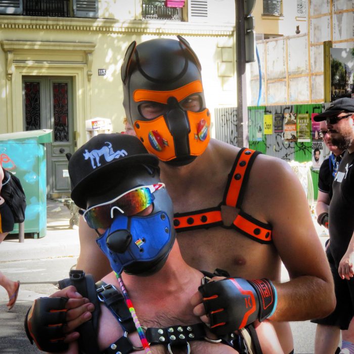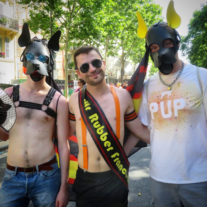 Le très sémillant Mr Rubber France accompagné de ses deux puppies. Quoi de plus charmant ? Je n’ai jamais compris le problème que certains pouvaient avoir avec les représentations BDSM à la Marche des Fiertés. Il y a des mecs cagoulés et enchaînés, bah c’est leur trip, chacun son truc. Et ce n’est pas très compliqué à expliquer, même à des gamins.
