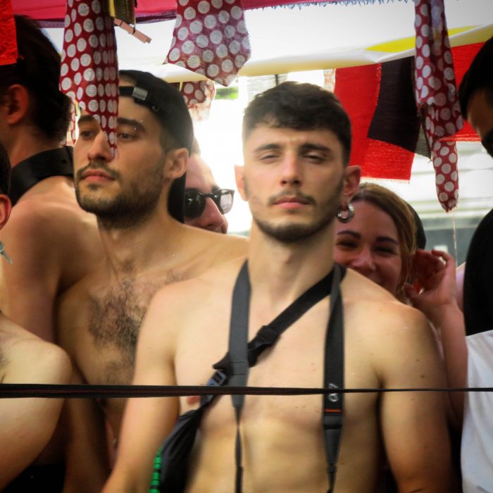 Sans doute la rencontre la plus improbable du jour, ce type absolument ravissant et bien foutu, qui souriait à tout le monde avec ses pinces à tétons et son tutu noir. C’est vraiment le genre de rencontre « queer » qui fait du bien, un mec qu’on pourraît trop facilement soupçonner de masc4masc, et qui se révèle le plus mascara4mascara. We likey!!