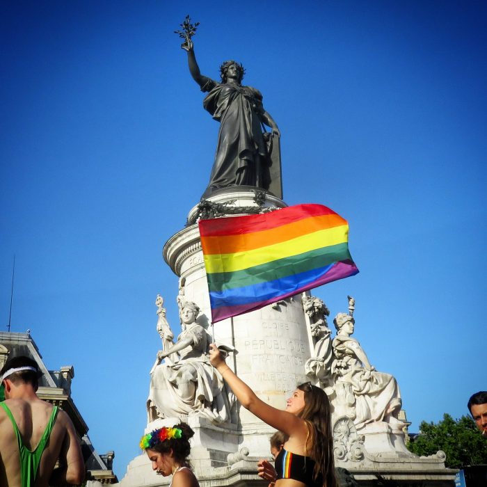 Et comme à chaque fois, depuis que la Pride arrive à la République, j’aime prendre une photo du drapeau au plus près de la statue, et de son symbole. C’est joli non ? Moi je trouve.