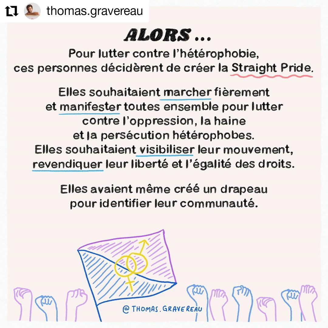 A chaque mois des Fiertés ou marche éponyme, on retrouve ces déclarations et assertions ubuesque qui crient à l’hétérophobie et la nécessité d’une « Straight Pride » en réponse. Mais là c’est l’illustrateur Thomas Gravereau qui propose sur son compte Instagram l’histoire de l’hétérophobie en 10 images. Suivez-bien c’est très éloquent. Hu hu hu.