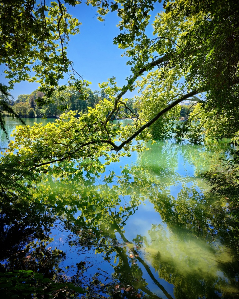 J’ai profité d’un déplacement à Lugdunum pour traverser son plus fameux parc, en me rendant à un salon professionnel. Je ne le connaissais que très peu, et sa pièce d’eau en cette journée caniculaire fut une bénédiction. Évidemment les reflets du ciel bleu et de sa nature bien verte, m’a fait mitrailler tout cela avec bonheur.
