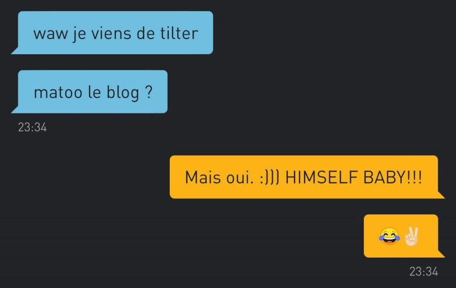 ). Cela me fait mourir de rire de recevoir de telles marques d’estime sur une app de cul, mais ce sont les outils de communication de notre époque.